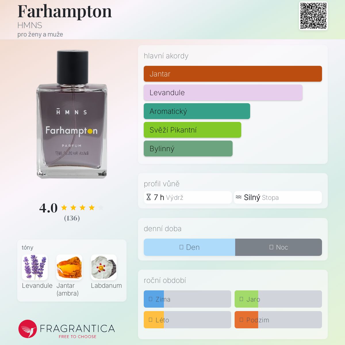 Farhampton podle HMNS je Aromatic Fougere vůně pro ženy a muže. Farhampton byl/a uveden/a v roce 2020. "Nosem" za touto vůní je Karina Mandala.