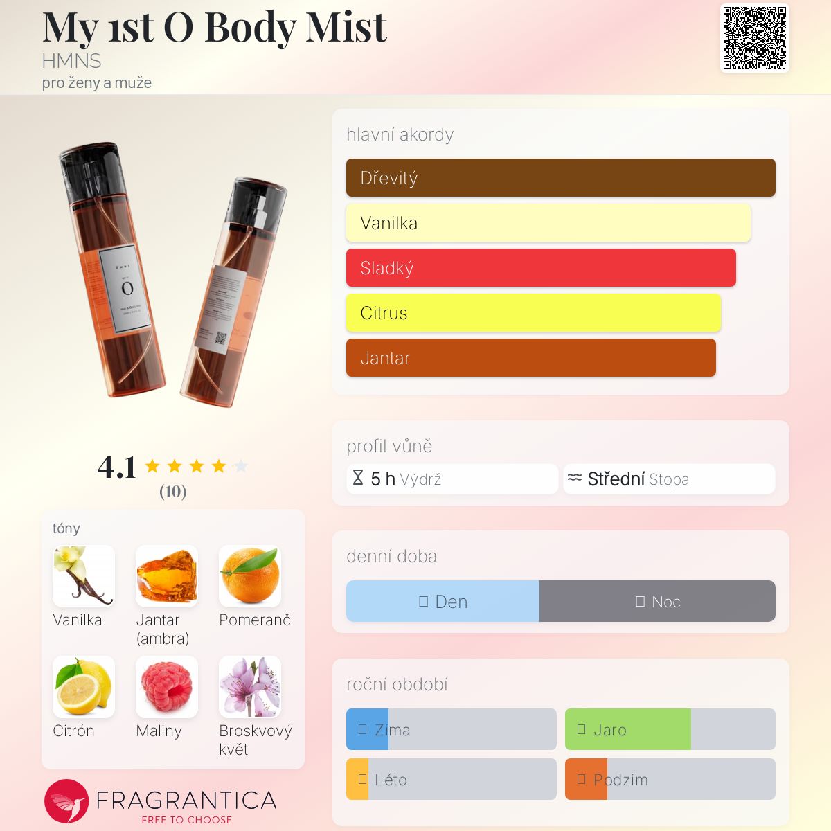 My 1st O Body Mist podle HMNS je vůně pro ženy a muže. My 1st O Body Mist byl/a uveden/a v roce 2022. Vrchní tóny jsou Pomeranč, Citrón, Maliny a Broskvový květ; střední tóny jsouJasmín, Kokos, Okvětní lístky růží a Karamel ; základní tóny jsou Vanilkový lusk, Jantar (ambra), Pačuli, Santalové dřevo a Dřevité tóny.