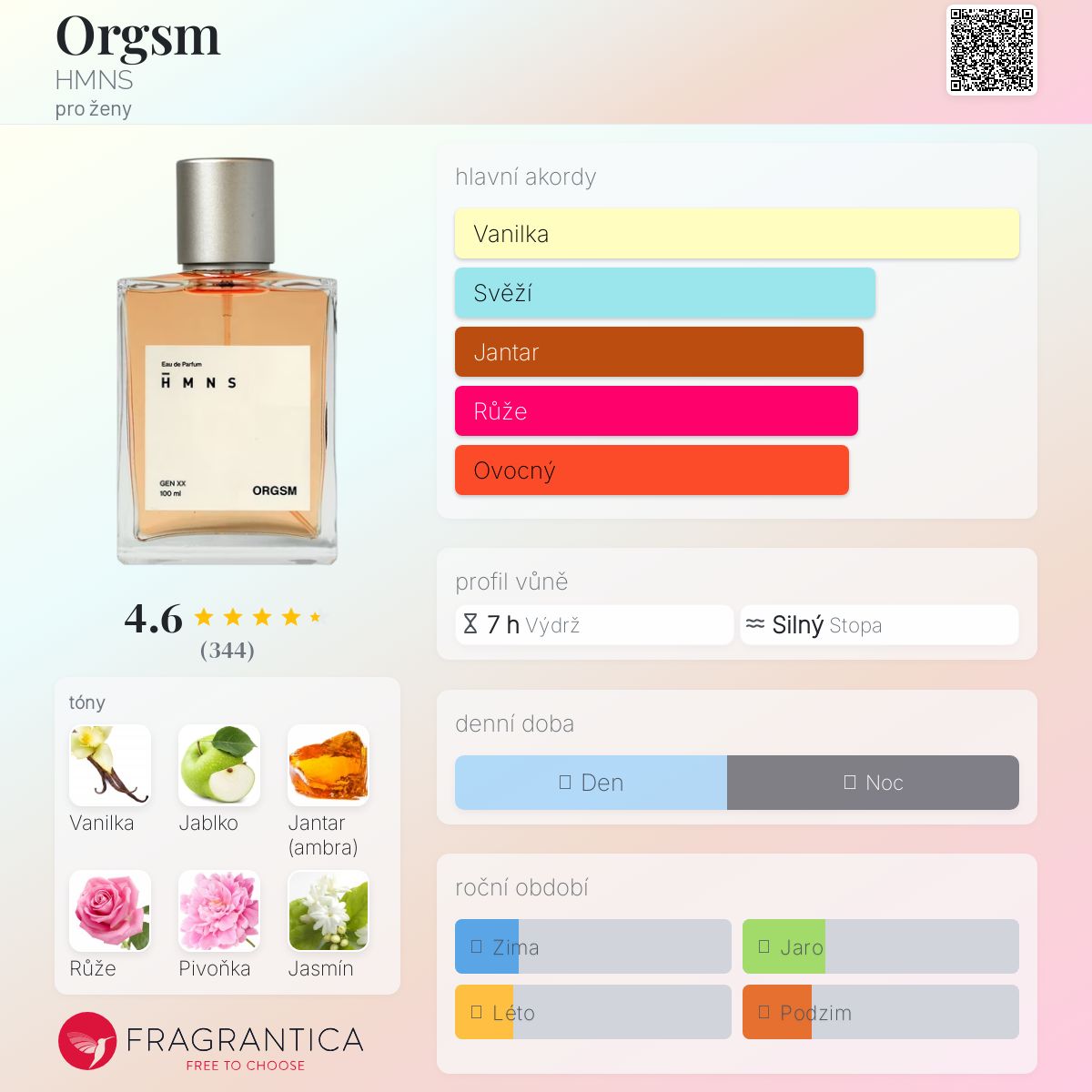 Orgsm podle HMNS je vůně pro ženy. Orgsm byl/a uveden/a v roce 2019. "Nosem" za touto vůní je Nanako Ogi. Vrchní tón je Jablko ; střední tóny jsouRůže, Pivoňka a Jasmín ; základní tóny jsou Vanilkový lusk a Jantar (ambra).