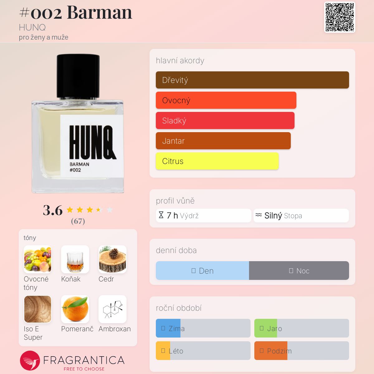 #002 Barman podle HUNQ je vůně pro ženy a muže. #002 Barman byl/a uveden/a v roce 2021. Vrchní tóny jsou Sladký pomeranč, Grapefruit a Limetka; střední tóny jsouOvocné tóny a Brandy ; základní tóny jsou Texaský cedr, Iso E Super, Ambroxan, Fazole tonka, Seno, Slaměnka a Pačuli.