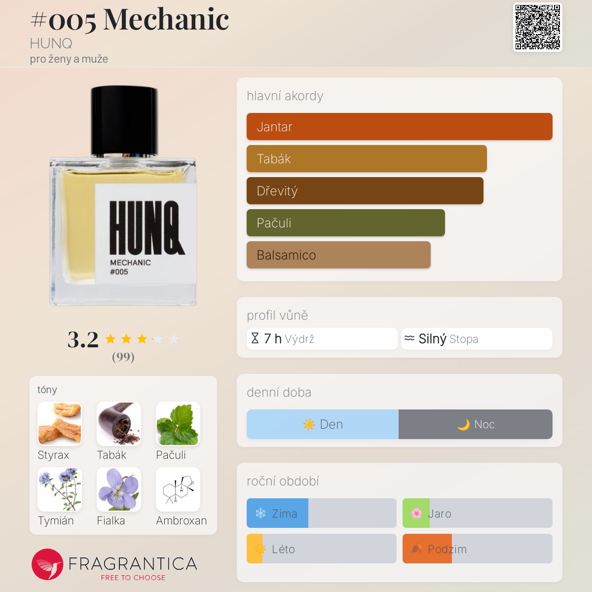 #005 Mechanic podle HUNQ je vůně pro ženy a muže. #005 Mechanic byl/a uveden/a v roce 2021. Vrchní tón je Červený tymián ; střední tóny jsouFialka a Petitgrain ; základní tóny jsou Styrax, Tabák, Pačuli, Ambroxan a Iso E Super.