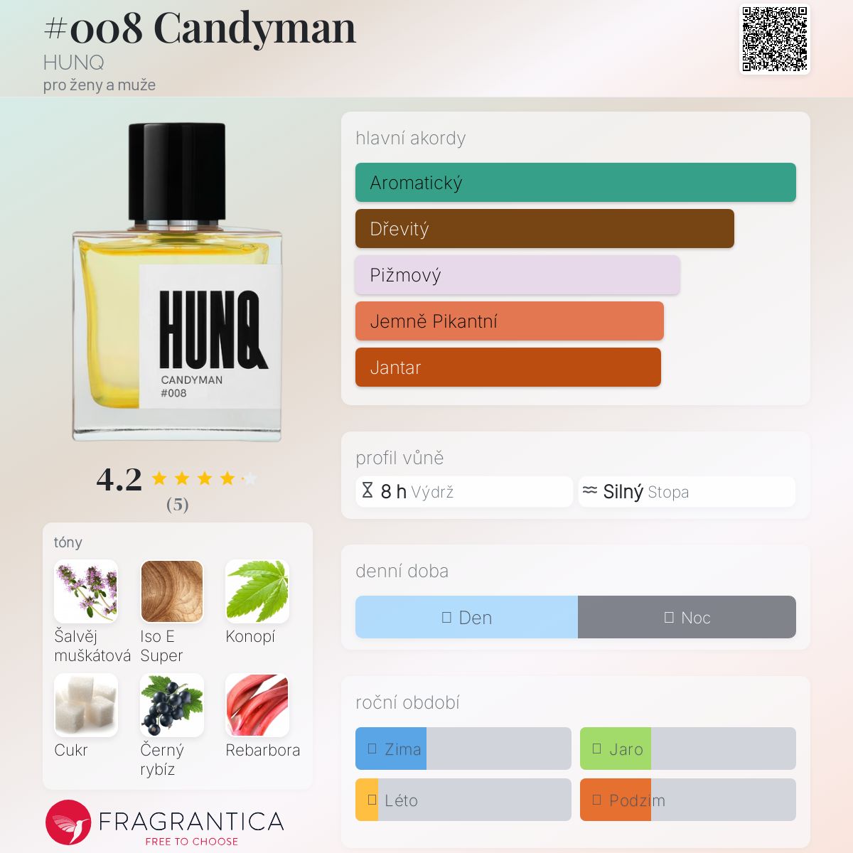 #008 Candyman podle HUNQ je Aromatic Fruity vůně pro ženy a muže. Toto je nová vůně. #008 Candyman byl/a uveden/a v roce 2025. "Nosem" za touto vůní je Margaux Le Paih Guérin. Vrchní tóny jsou Černý rybíz, Rebarbora a Maliny; střední tóny jsouŠalvěj muškátová, Konopí, Cukr a Vavříny ; základní tóny jsou Iso E Super, Ambroxan a Bílé pižmo.
