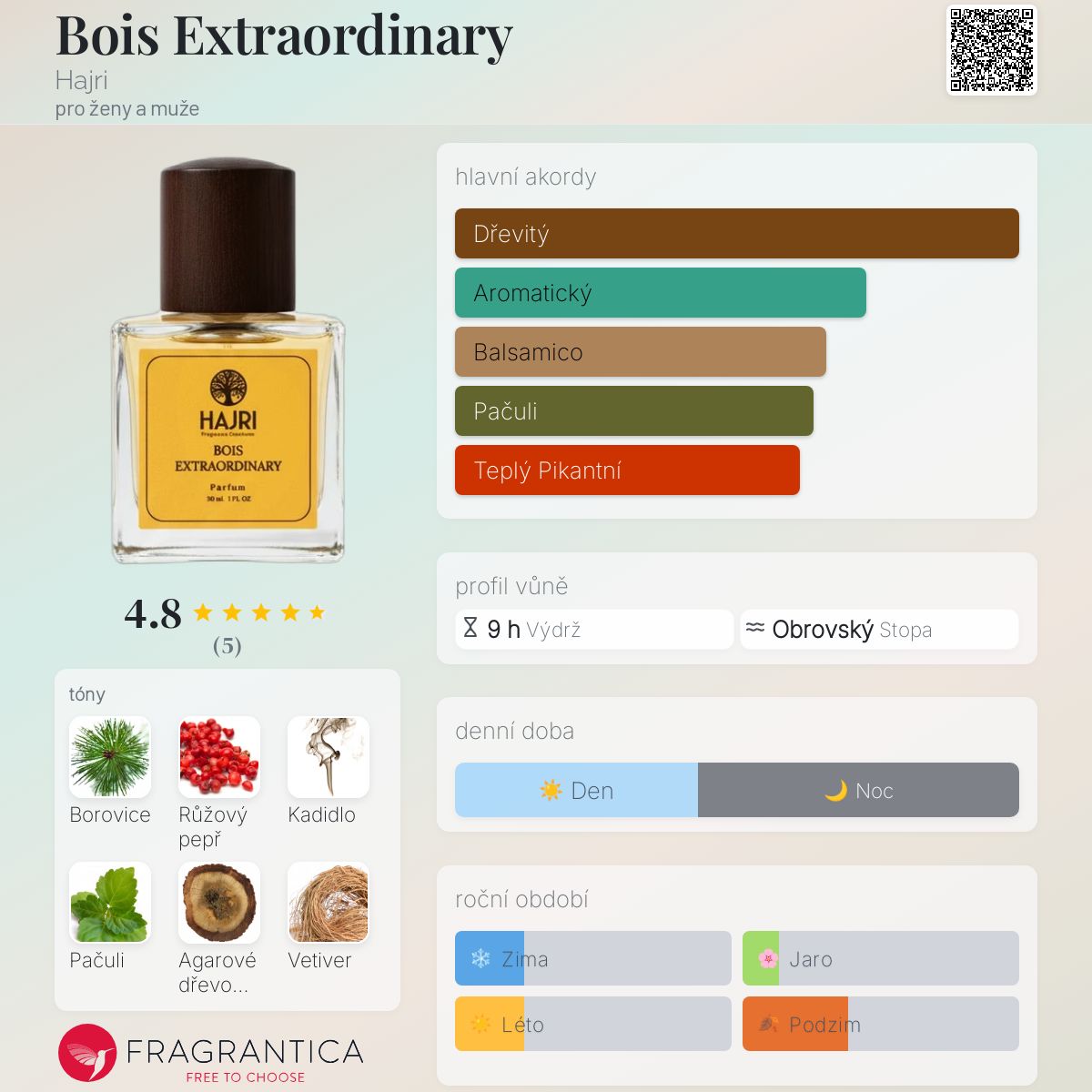 Bois Extraordinary podle Hajri je Orientální Woody vůně pro ženy a muže. Vrchní tóny jsou Růžový pepř, Kadidlo, Bergamot a Mandarinka; střední tóny jsouBorovice, Kadidlo a Agarové dřevo (oud) ; základní tóny jsou Pačuli, Vetiver, Ambra a Pižmo.