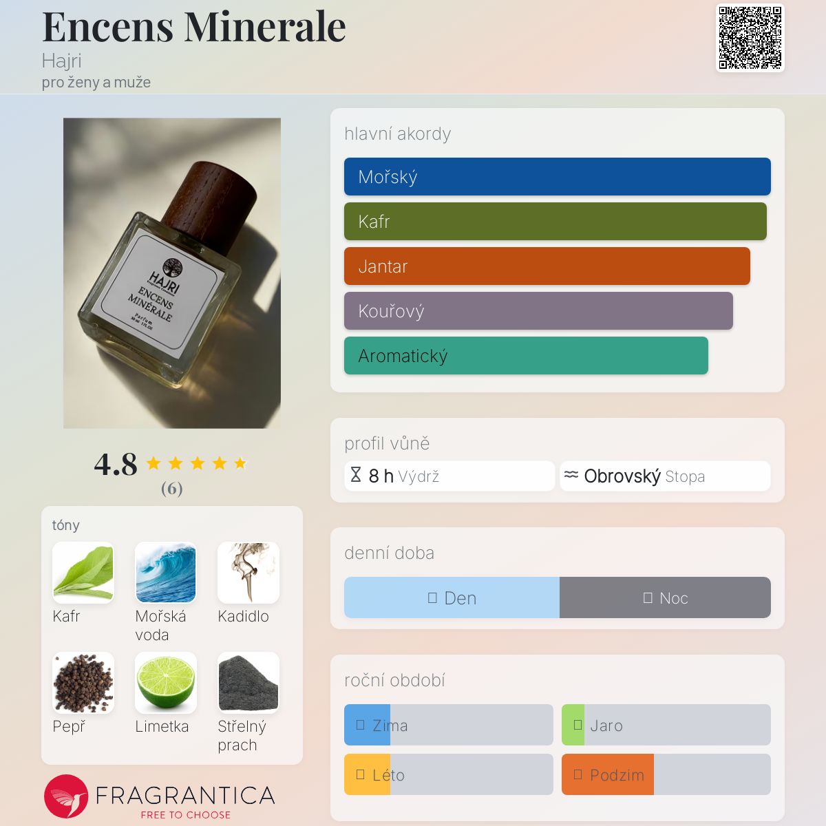 Encens Minerale podle Hajri je Orientální Woody vůně pro ženy a muže. Vrchní tóny jsou Kafr, Černý pepř, Limetka a Kadidlo; střední tóny jsouMořské tóny, Kadidlo a Střelný prach ; základní tóny jsou Ambra, Labdanum, Vetiver a Pižmo.