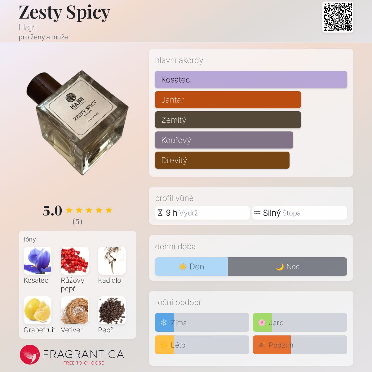 Zesty Spicy podle Hajri je Woody Spicy vůně pro ženy a muže. Vrchní tóny jsou Růžový pepř, Grapefruit, Černý pepř, Olibanum a Citrón; střední tóny jsouKosatec a Kadidlo ; základní tóny jsou Vetiver, Santalové dřevo, Ambroxan a Pižmo.