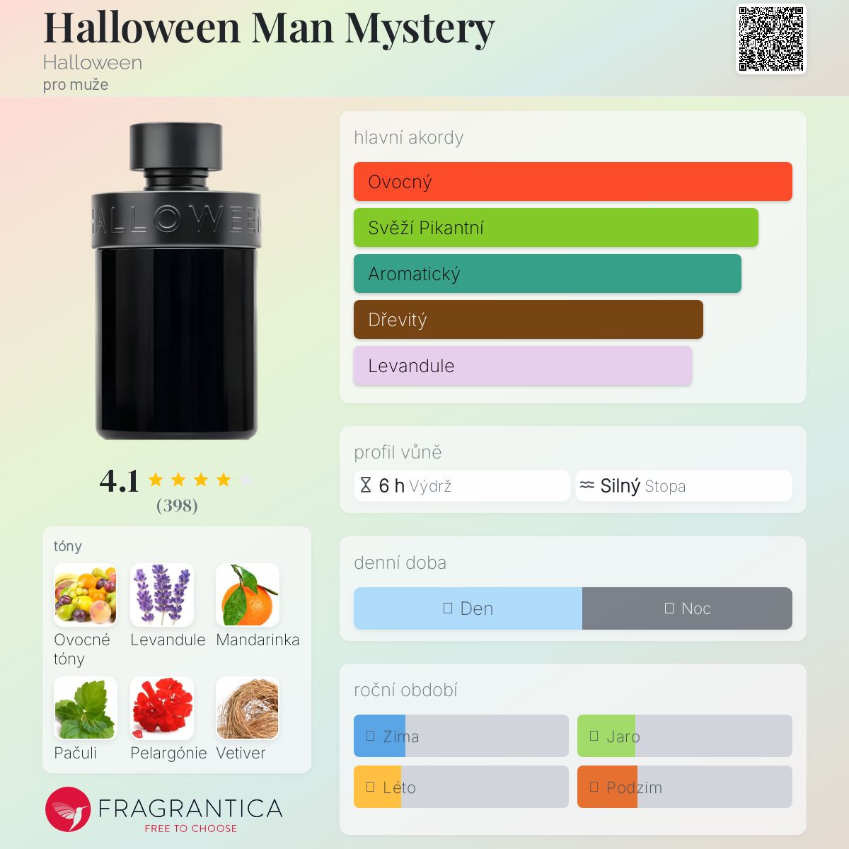Halloween Man Mystery podle Halloween je Woody Aromatic vůně pro muže. Halloween Man Mystery byl/a uveden/a v roce 2023. "Nosem" za touto vůní je Nicolas Beaulieu. Vrchní tóny jsou Levandule, Mandarinka, Černý pepř a Broskvový květ; střední tóny jsouOvocné tóny, Pelargónie a Lískový oříšek ; základní tóny jsou Pačuli, List indonéského pačuli a Vetiver.