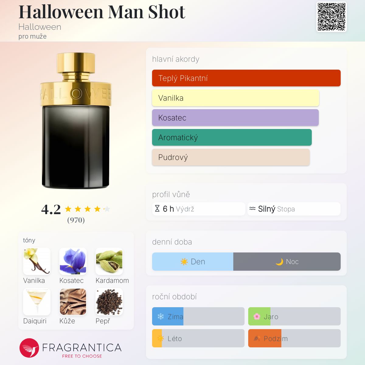 Halloween Man Shot podle Halloween je Orientální Spicy vůně pro muže. Halloween Man Shot byl/a uveden/a v roce 2016. Vrchní tóny jsou Kardamom, Daiquiri, Černý pepř a Citrón; střední tóny jsouKosatec a Šalvěj ; základní tóny jsou Vanilka, Kůže a Jantarové dřevo.
