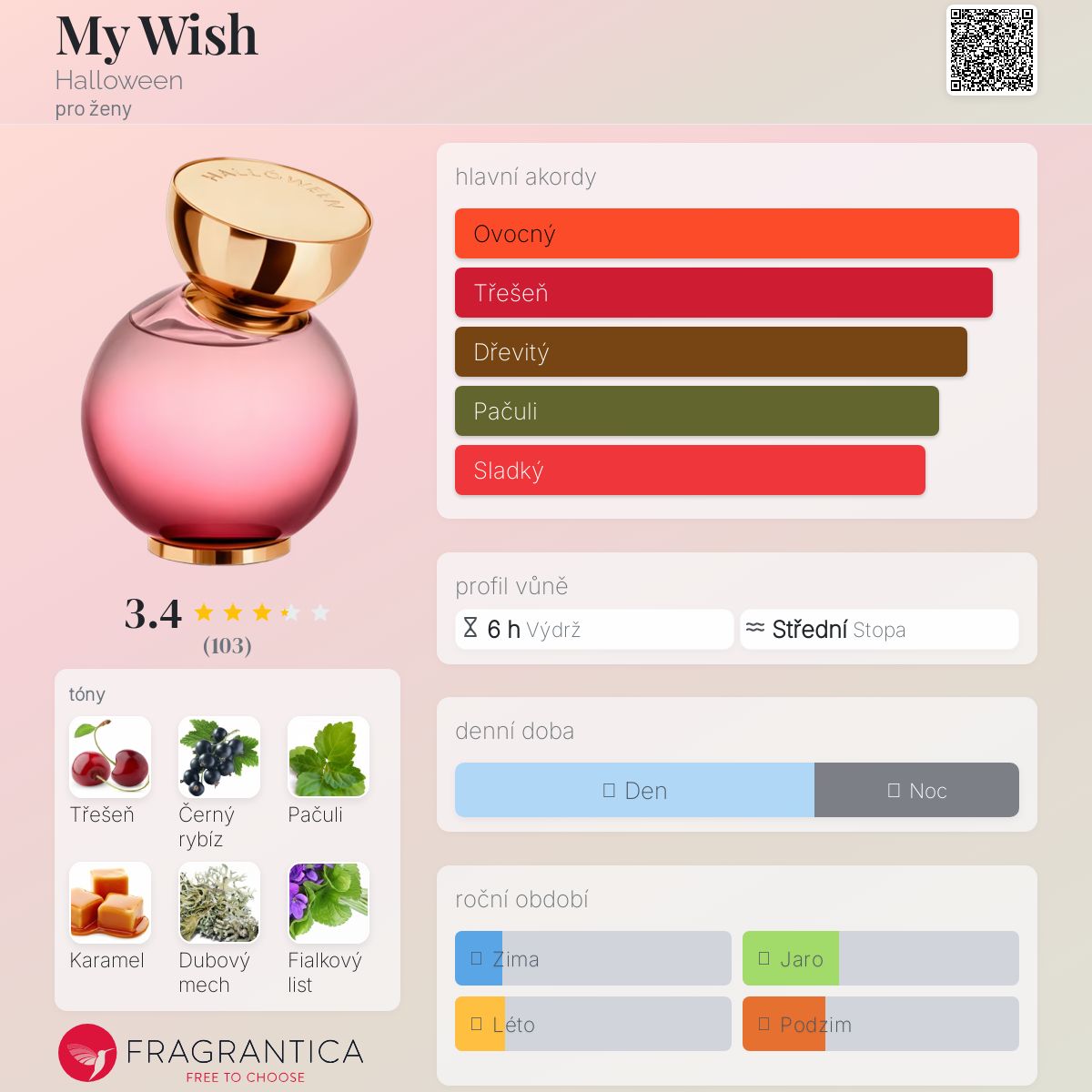 My Wish podle Halloween je Floral Fruity Gourmand vůně pro ženy. Toto je nová vůně. My Wish byl/a uveden/a v roce 2024. Vrchní tóny jsou Třešeň, Černý rybíz a Fialkový list; střední tóny jsouGardénie a Jasmín ; základní tóny jsou Pačuli, Karamel a Mech.