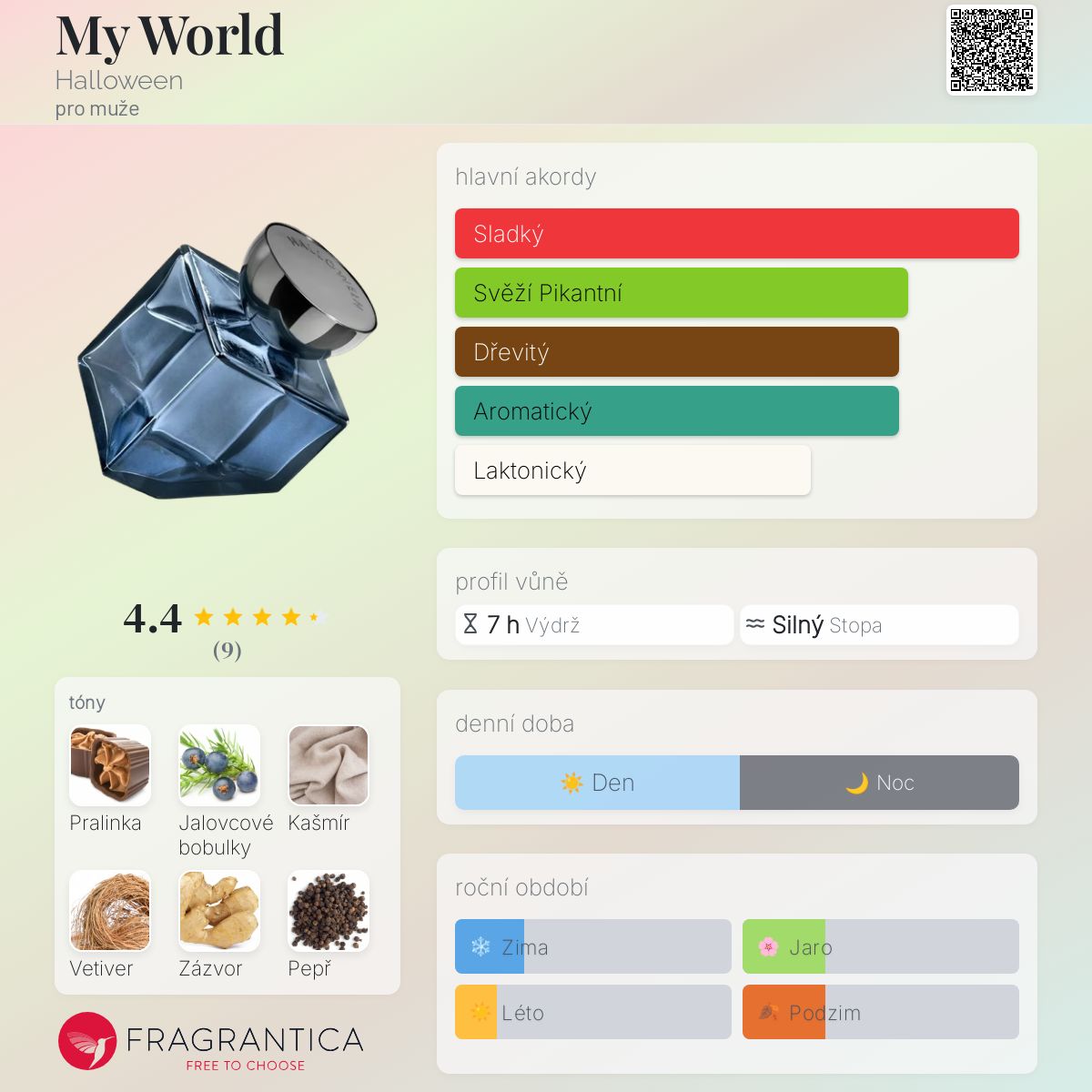My World podle Halloween je Woody Spicy vůně pro muže. Toto je nová vůně. My World byl/a uveden/a v roce 2025. Vrchní tóny jsou Zázvor, Kardamom a Bergamot; střední tóny jsouJalovcové bobulky, Černý pepř, Pomerančový květ a Šalvěj muškátová ; základní tóny jsou Pralinka, Kašmír a Vetiver.
