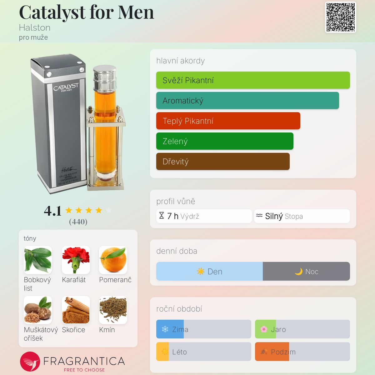 Catalyst for Men podle Halston je Aromatic Fougere vůně pro muže. Catalyst for Men byl/a uveden/a v roce 1994. Catalyst for Men byl/a vytvořen/a Ilias Ermenidis a Harry Fremont. Vrchní tóny jsou Pomeranč, Kmín, Levandule, Vodka, Galbanum, Mandarinka, Pelyněk, Máta, Bergamot, Šalvěj, Bazalka, Jasmín, Narcis, Růžový olej a Tuberóza; střední tóny jsouBobkový list, Karafiát, Muškátový oříšek, Skořice, Zelená tráva, Heřmánek, Černý rybíz, Konvalinka, Růže a Fialka ; základní tóny jsou Santalové dřevo, Kůže, Jantar (ambra), Kadidlo, Cedr, Fazole tonka, Dubový mech, Vetiver, Benzoin, Pižmo, Labdanum, Kokos a Pačuli.