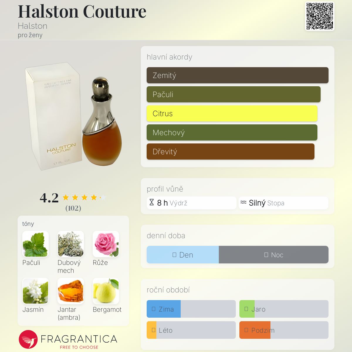 Halston Couture podle Halston je Woody Chypre vůně pro ženy. Halston Couture byl/a uveden/a v roce 1988. Vrchní tóny jsou Bergamot a Citrón; střední tóny jsouPačuli, Růže a Jasmín ; základní tóny jsou Dubový mech a Jantar (ambra).