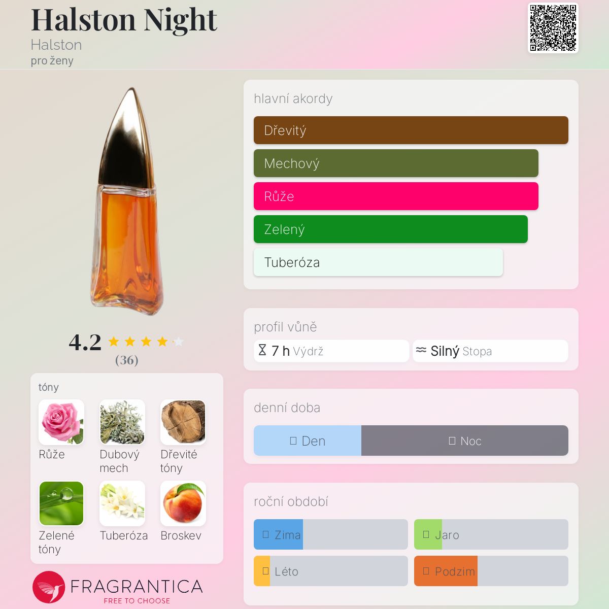 Halston Night podle Halston je Orientální Floral vůně pro ženy. Halston Night byl/a uveden/a v roce 1980. Vrchní tóny jsou Zelené tóny a Broskev; střední tóny jsouRůže a Tuberóza ; základní tóny jsou Mech, Dřevité tóny a Jantar (ambra).
