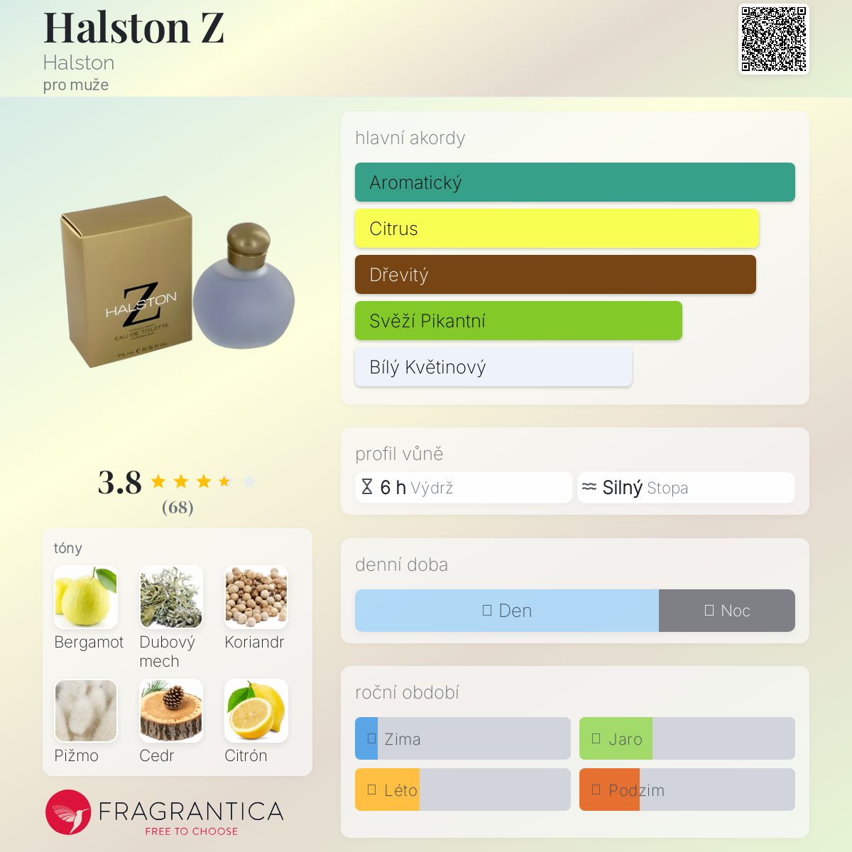 Halston Z podle Halston je Woody Aromatic vůně pro muže. Halston Z byl/a uveden/a v roce 1998. Vrchní tóny jsou Bergamot, Koriandr, Citrón, Mandarinka a Levandule; střední tóny jsouCedr, Pelargónie, Jalovcové bobulky, Konvalinka, Jasmín a Neroli ; základní tóny jsou Dubový mech, Pižmo, Vetiver, Ambra, Santalové dřevo a Palisandr.