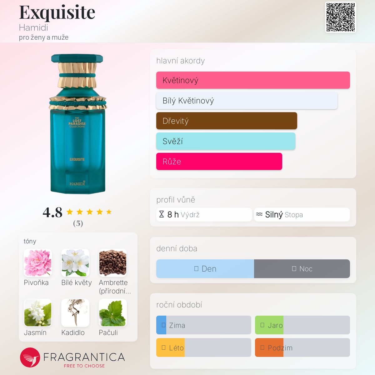 Exquisite podle Hamidi je vůně pro ženy a muže. Exquisite byl/a uveden/a v roce 2023. Vrchní tóny jsou Pivoňka, Bílé květy, Bergamot a Koriandr; střední tóny jsouAmbrette (přírodní pižmo), Jasmín a Růže ; základní tóny jsou Kadidlo, Pačuli a Dřevité tóny.
