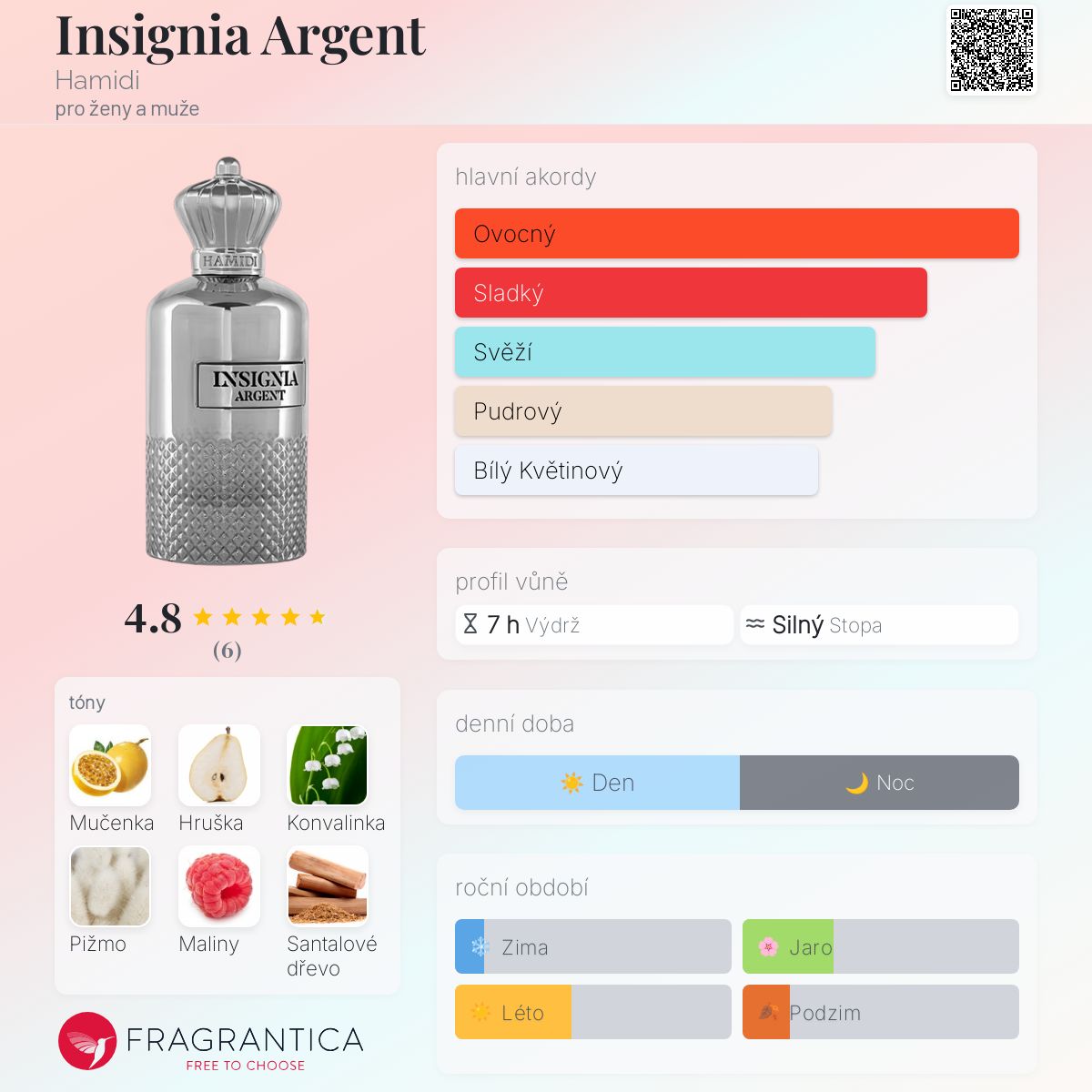 Insignia Argent podle Hamidi je vůně pro ženy a muže. Insignia Argent byl/a uveden/a v roce 2023. Vrchní tóny jsou Mučenka, Hruška, Maliny, Černý rybíz a Broskev; střední tón jeKonvalinka ; základní tóny jsou Pižmo, Santalové dřevo, Vanilka a Pačuli.