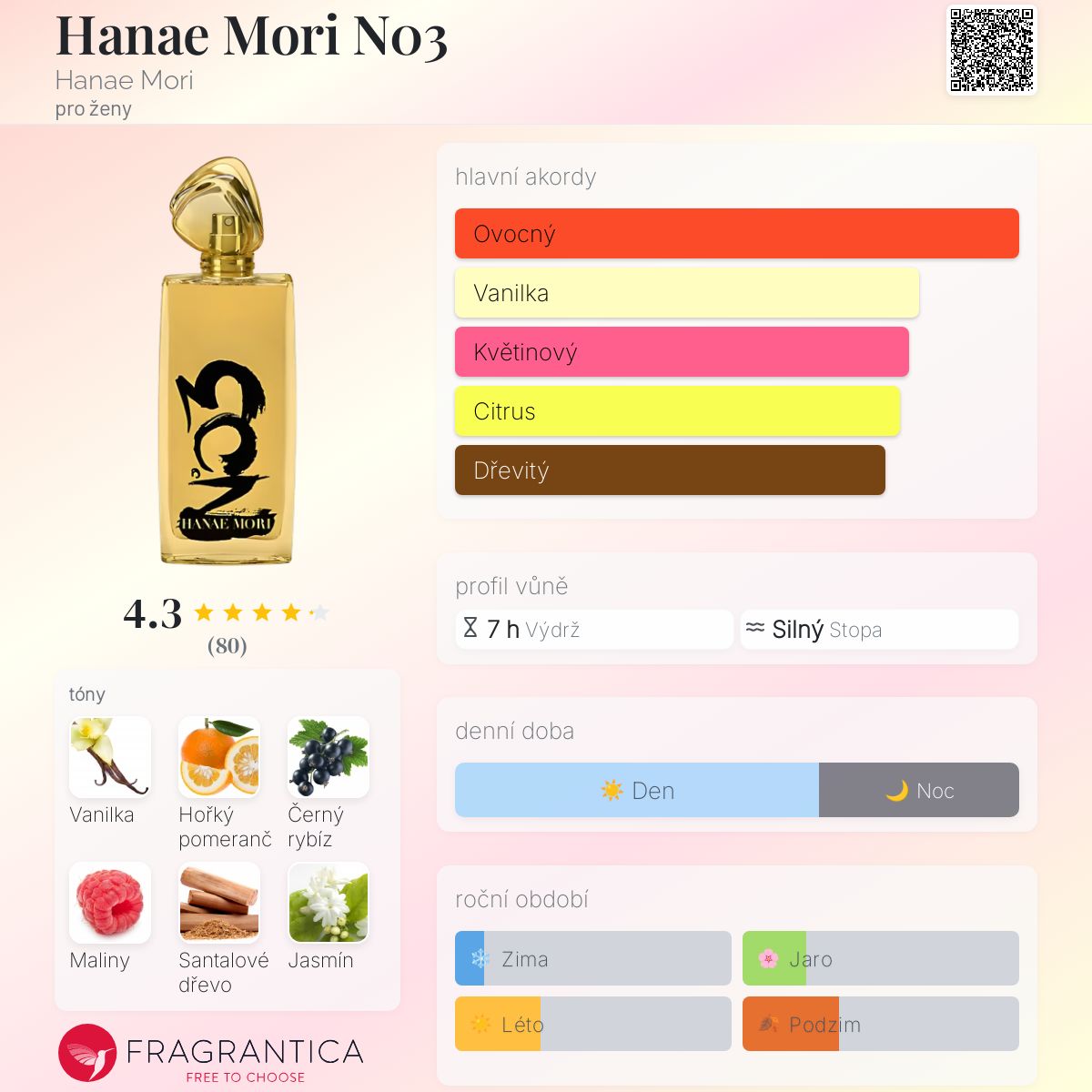 Hanae Mori N03 podle Hanae Mori je Floral Fruity vůně pro ženy. Hanae Mori N03 byl/a uveden/a v roce 2011. Vrchní tóny jsou Hořký pomeranč, Černý rybíz a Slunečnice; střední tóny jsouMaliny, Jasmín a Frézie ; základní tóny jsou Vanilka, Santalové dřevo a Pižmo.