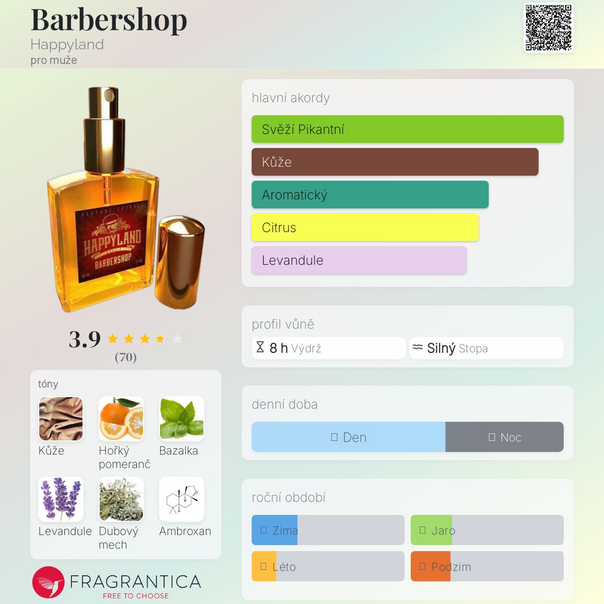 Barbershop podle Happyland je vůně pro muže. Barbershop byl/a uveden/a v roce 2019. "Nosem" za touto vůní je E.J. Wells. Vrchní tóny jsou Hořký pomeranč, Bazalka a Ambroxan; střední tóny jsouKůže a Pepř ; základní tóny jsou Levandule, Dubový mech, Pižmo a Fazole tonka.