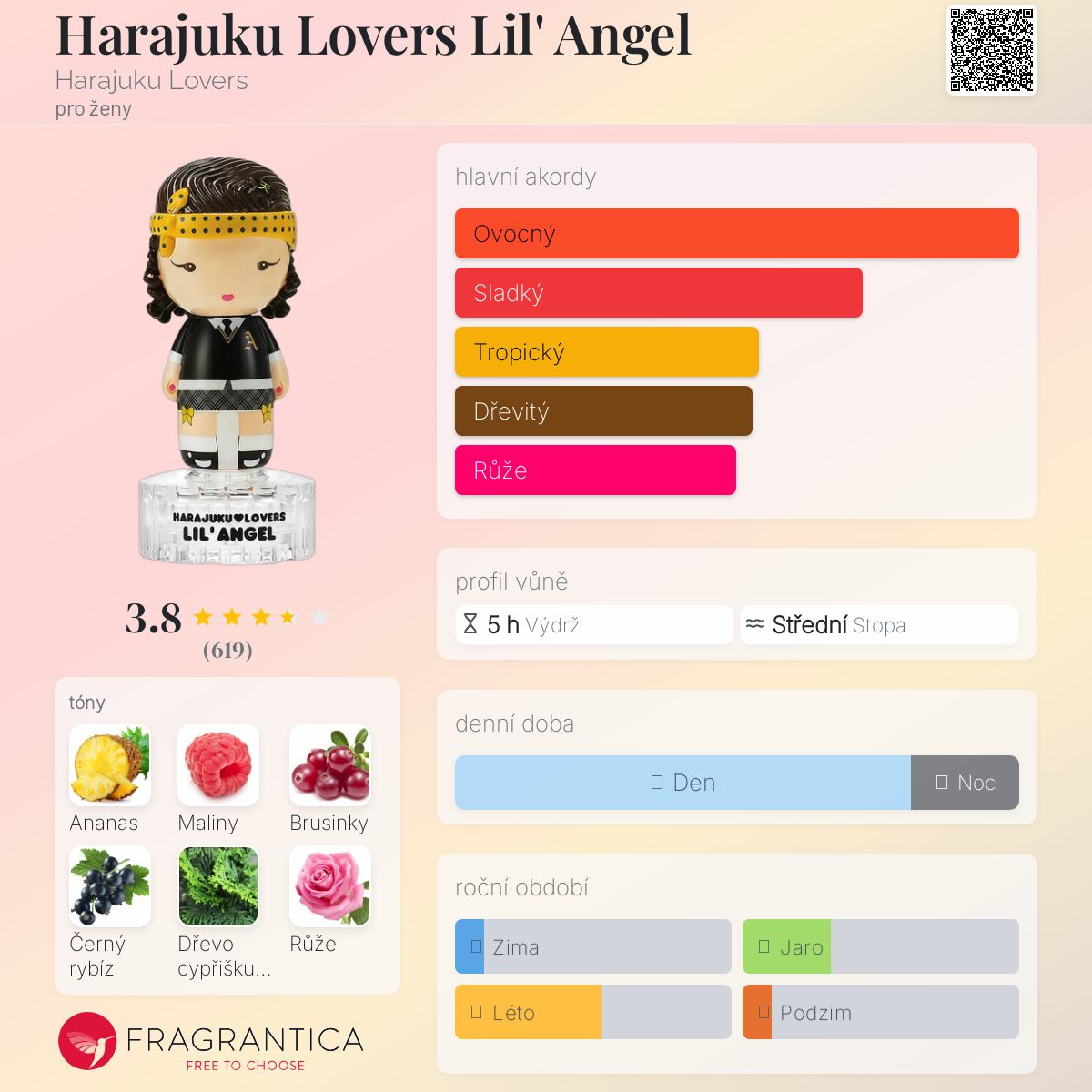 Harajuku Lovers Lil' Angel podle Harajuku Lovers je Floral Fruity vůně pro ženy. Harajuku Lovers Lil' Angel byl/a uveden/a v roce 2008. "Nosem" za touto vůní je Christophe Raynaud. Vrchní tóny jsou Ananas, Maliny, Brusinky a Černý rybíz; střední tóny jsouRůže a Fialka ; základní tóny jsou Dřevo cypřišku tupolistého a Jantar (ambra).