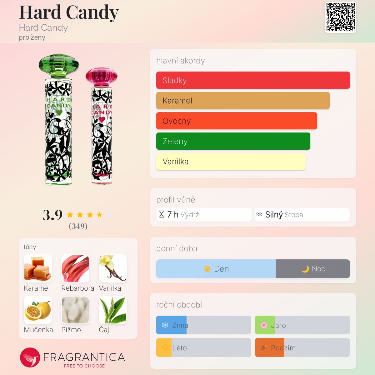 Hard Candy podle Hard Candy je Floral Fruity Gourmand vůně pro ženy. Hard Candy byl/a uveden/a v roce 2007. Vrchní tóny jsou Rebarbora, Bílý čaj a Růžový pepř; střední tóny jsouMučenka, Jasmín a Růže ; základní tóny jsou Karamel, Vanilka, Kašmírové pižmo a Cedr.