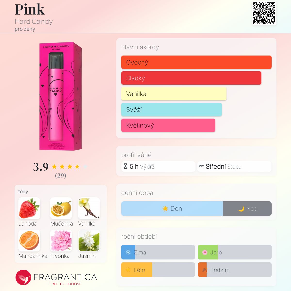 Pink podle Hard Candy je Floral Fruity vůně pro ženy. Pink byl/a uveden/a v roce 2017. Vrchní tóny jsou Jahoda, Mučenka a Mandarinka; střední tóny jsouRůžová pivoňka, Jasmín, Růžová růže a Fialka ; základní tóny jsou Vanilkový cukr, Pižmo, Bílý jantar (ambra) a Dřevité tóny.