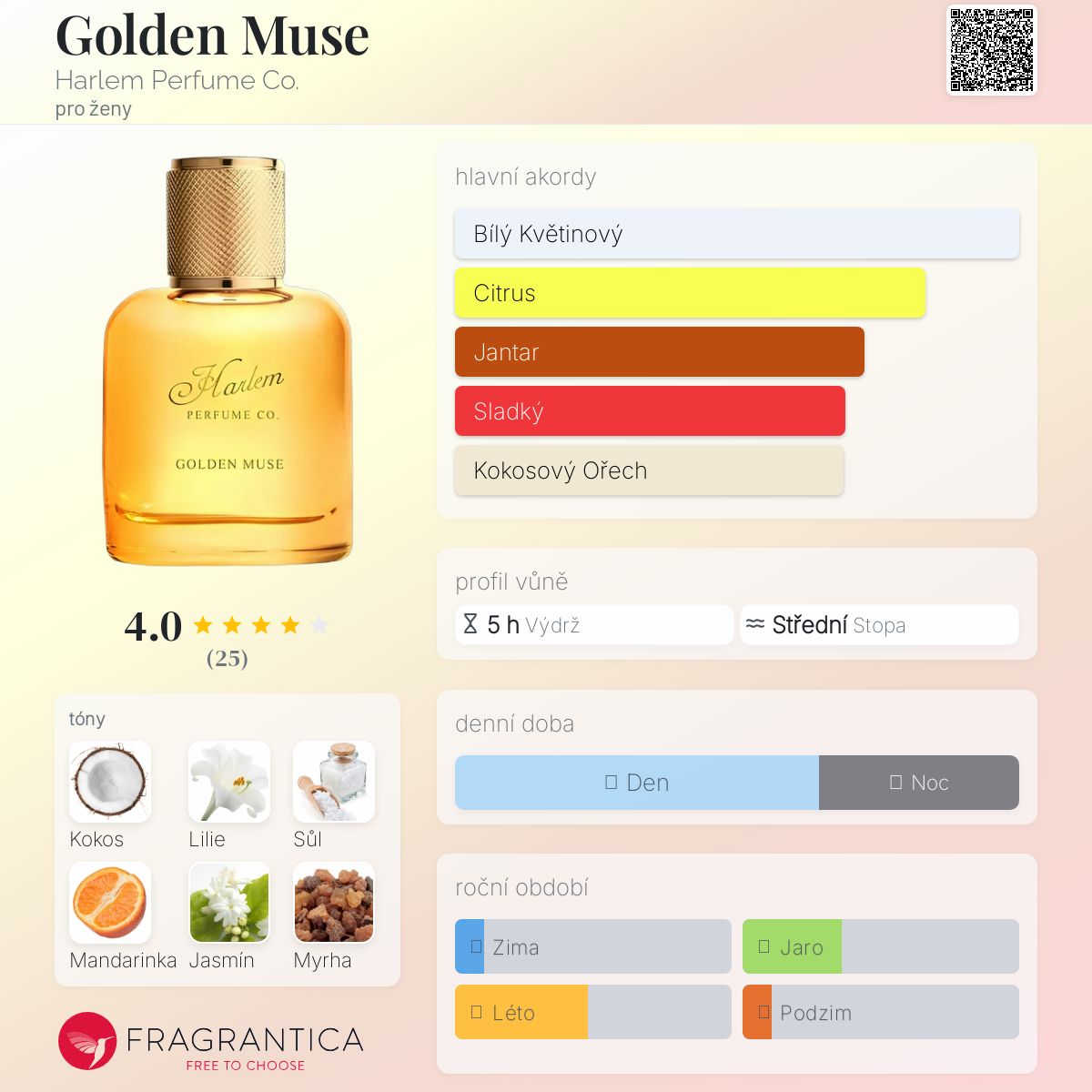 Golden Muse podle Harlem Perfume Co. je Floral Woody Musk vůně pro ženy. Toto je nová vůně. Golden Muse byl/a uveden/a v roce 2025. "Nosem" za touto vůní je Bérénice Watteau.