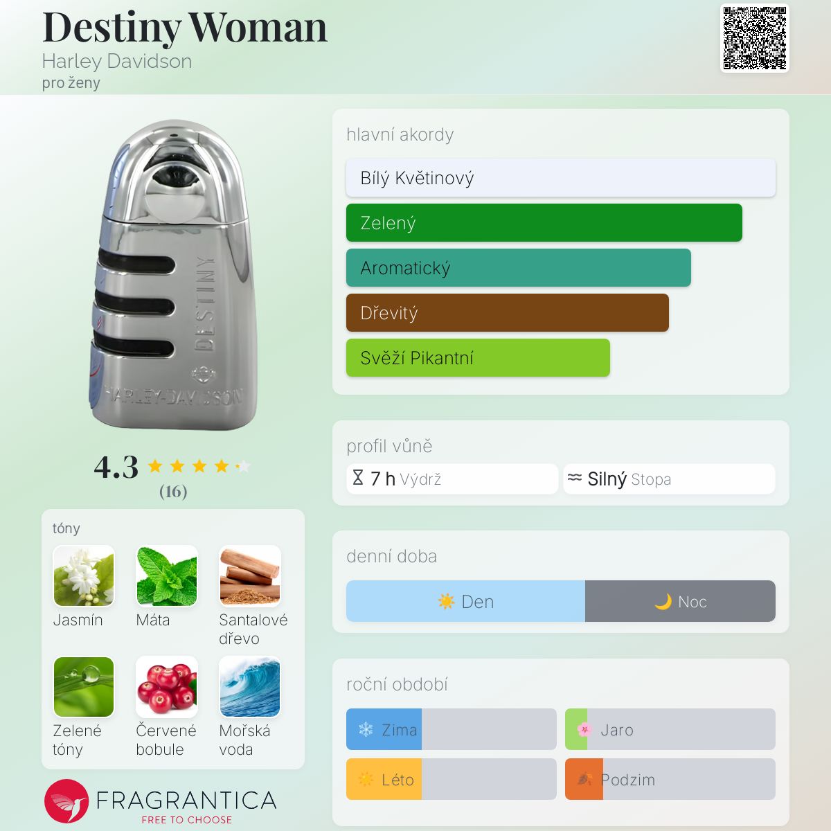 Destiny Woman podle Harley Davidson je Floral Green vůně pro ženy. Destiny Woman byl/a uveden/a v roce 1999. Destiny Woman byl/a vytvořen/a Philippe Bousseton a Sylvie Fischer. Vrchní tóny jsou Máta, Zelené listí, Červené bobule, Mořské tóny a Bergamot; střední tóny jsouJasmín a Růže ; základní tóny jsou Santalové dřevo a Cedr.