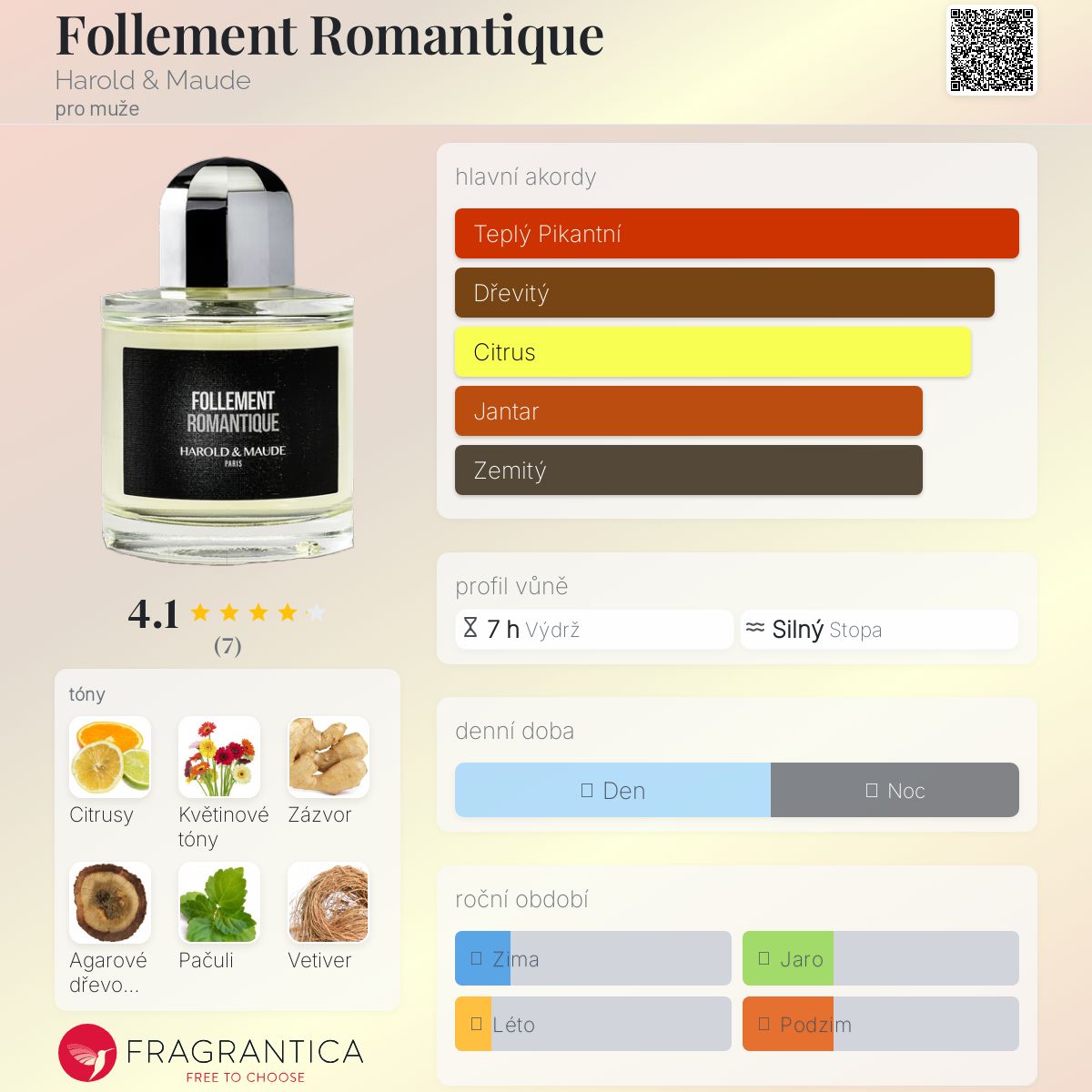Follement Romantique podle Harold & Maude je Woody Aromatic vůně pro muže. Toto je nová vůně. Follement Romantique byl/a uveden/a v roce 2023. "Nosem" za touto vůní je Nejla Barbir. Vrchní tón je Citrusy ; střední tóny jsouKvětiny a Zázvor ; základní tóny jsou Agarové dřevo (oud), Indické pačuli, Haitský vetiver, Jantar (ambra) a Pižmo.