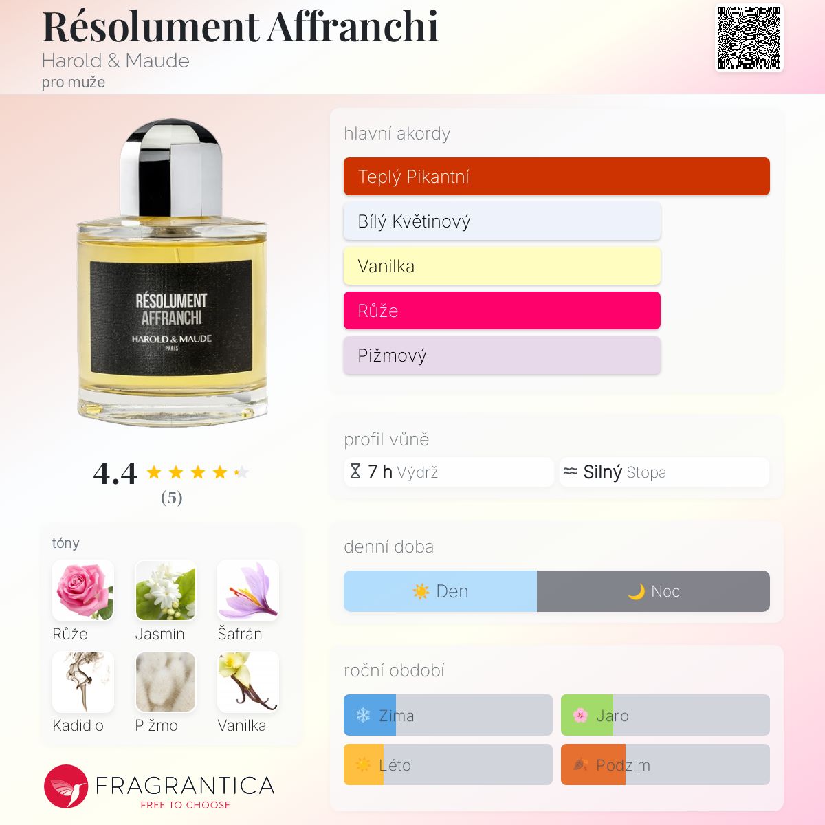Résolument Affranchi podle Harold & Maude je Woody Spicy vůně pro muže. Toto je nová vůně. Résolument Affranchi byl/a uveden/a v roce 2023. "Nosem" za touto vůní je Nejla Barbir. Vrchní tóny jsou Růže a Jasmín; střední tóny jsouŠafrán a Kadidlo ; základní tóny jsou Pižmo, Vanilka, Agarové dřevo (oud) a Indické pačuli.