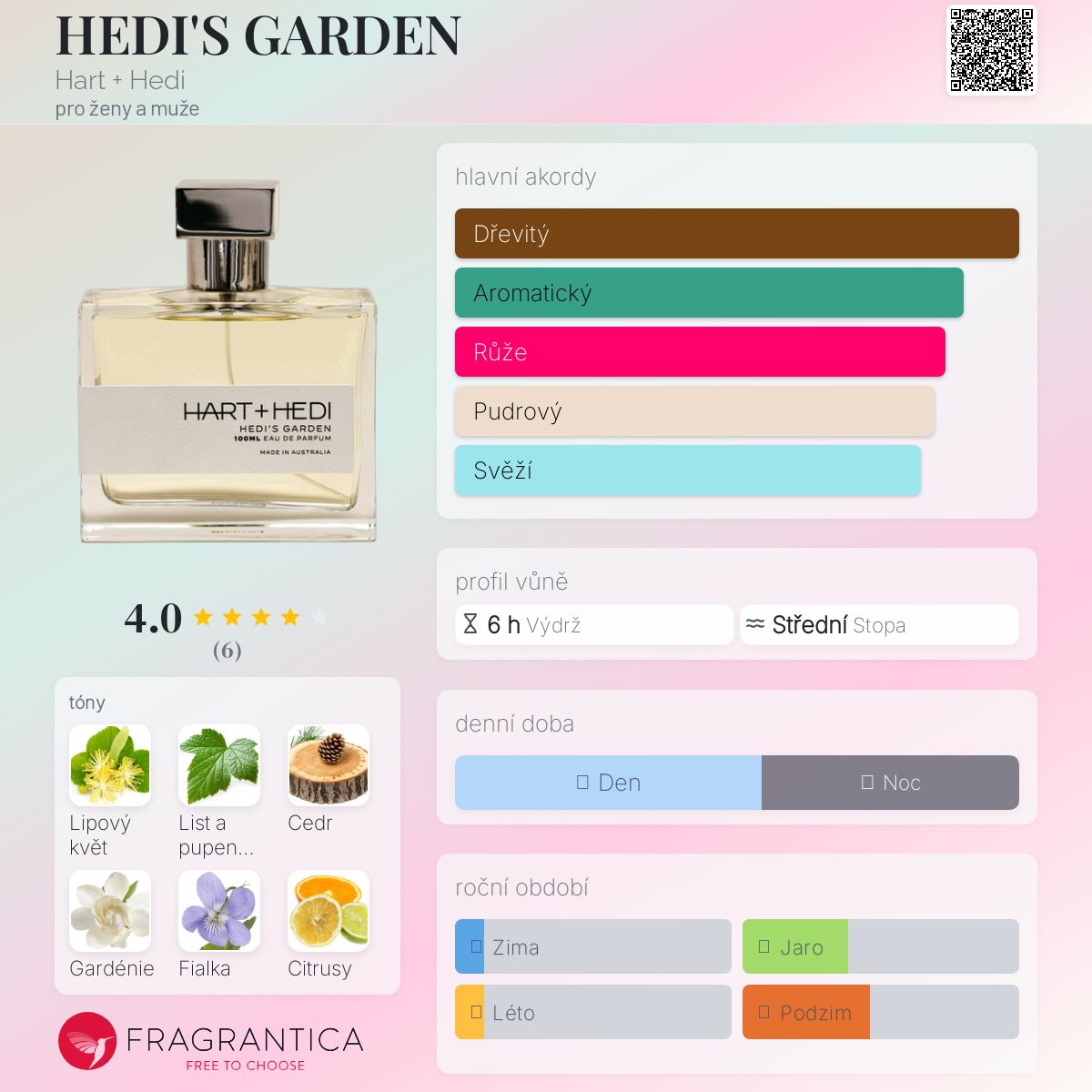 HEDI'S GARDEN podle Hart + Hedi je Floral vůně pro ženy a muže. Toto je nová vůně. HEDI'S GARDEN byl/a uveden/a v roce 2024. Vrchní tóny jsou Gardénie, Fialka a Citrusy; střední tóny jsouLipový květ, Růže a Pelargónie ; základní tóny jsou Černý rybíz, Cedr a Vetiver.