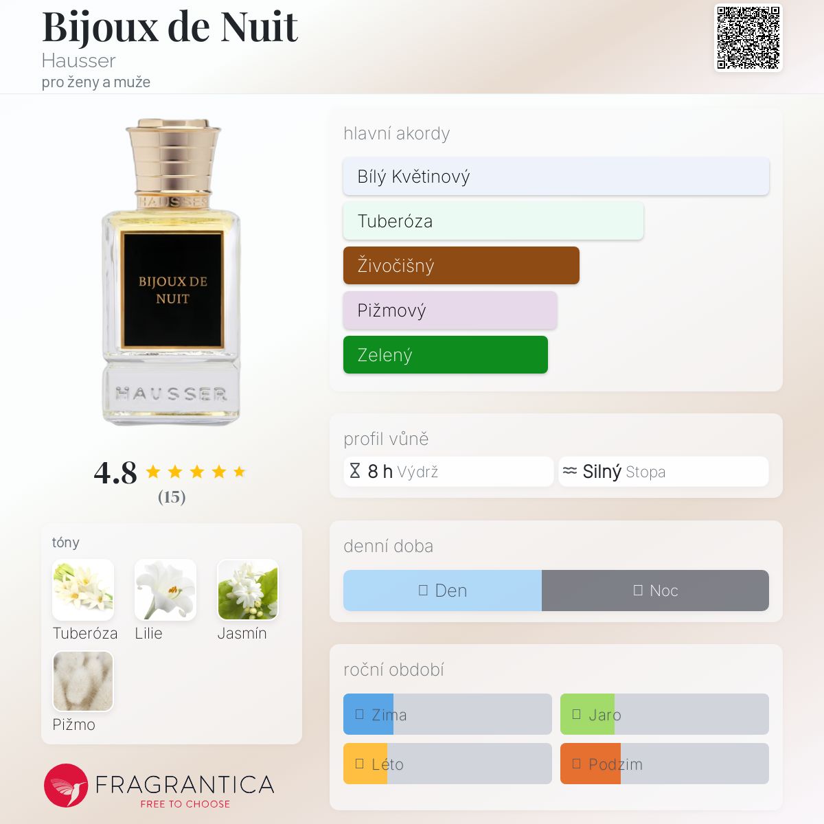 Bijoux de Nuit podle Hausser je Floral Woody Musk vůně pro ženy a muže. Bijoux de Nuit byl/a uveden/a v roce 2022. "Nosem" za touto vůní je Moe Alkaf.