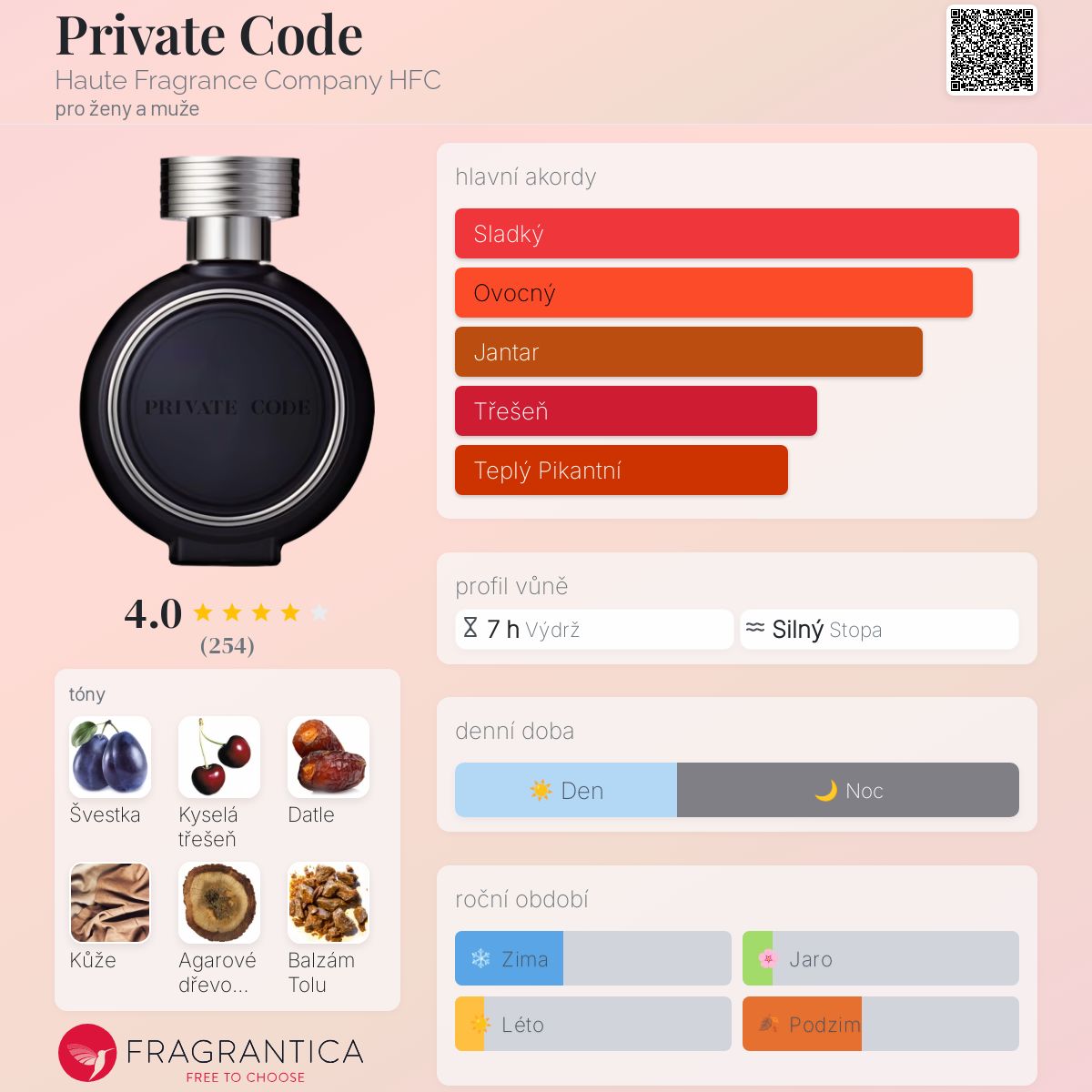 Private Code podle Haute Fragrance Company HFC je Orientální Vanilla vůně pro ženy a muže. Private Code byl/a uveden/a v roce 2022. "Nosem" za touto vůní je Vincent Ricord. Vrchní tóny jsou Švestka, Višeň, Olibanum a Vonokvětka; střední tóny jsouDatle, Kůže, Růže a Kořen kosatce ; základní tóny jsou Agarové dřevo (oud), Balzám Tolu, Kadidlo, Benzoin a Pižmo.