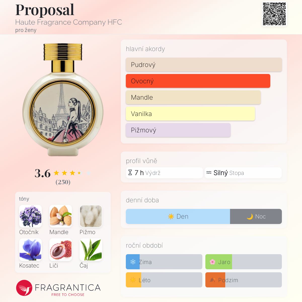 Proposal podle Haute Fragrance Company HFC je Floral Woody Musk vůně pro ženy. Proposal byl/a uveden/a v roce 2018. "Nosem" za touto vůní je Vincent Ricord. Vrchní tóny jsou Sladká mandle, Liči, Černý rybíz a Bergamot; střední tóny jsouOtočník, Černý čaj, Sušené ovoce, Jasmín Sambac a Italský jasmín ; základní tóny jsou Bílé pižmo, Kosatec, Fazole tonka, Týkové dřevo, Vanilka a Pačuli.