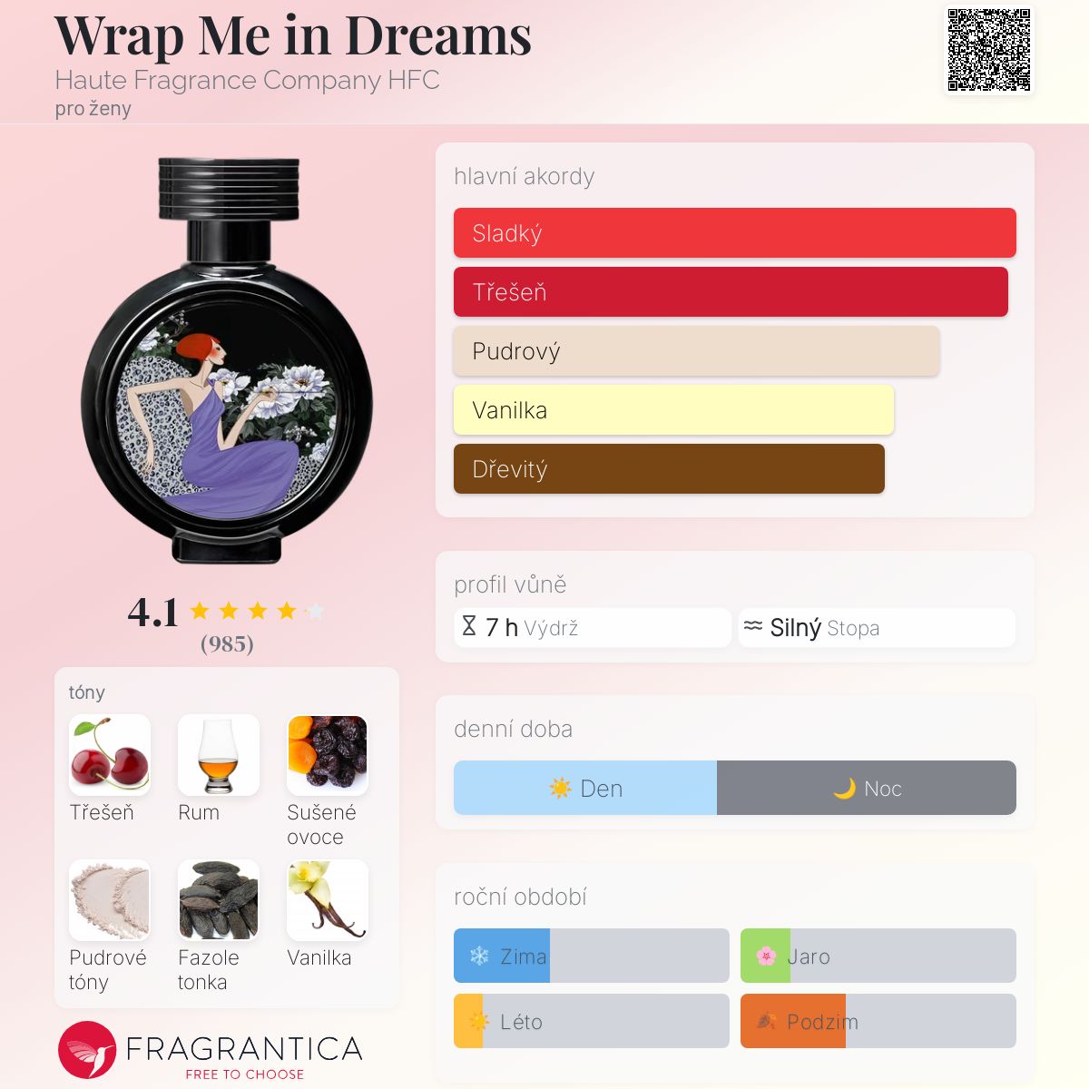 Wrap Me in Dreams podle Haute Fragrance Company HFC je Orientální Vanilla vůně pro ženy. Wrap Me in Dreams byl/a uveden/a v roce 2020. "Nosem" za touto vůní je Benoît Bergia. Vrchní tóny jsou Třešeň, Rum a Sušené ovoce; střední tóny jsouFazole tonka, Dřevité tóny a Pačuli ; základní tóny jsou Pudrové tóny, Vanilka, Pižmo a Pivoňka.