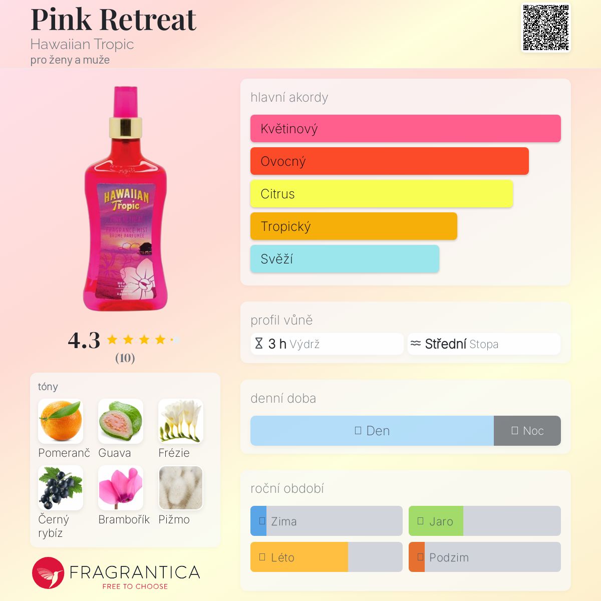 Pink Retreat podle Hawaiian Tropic je Floral Fruity vůně pro ženy a muže. Pink Retreat byl/a uveden/a v roce 2017. Vrchní tóny jsou Pomeranč, Guava a Černý rybíz; střední tóny jsouFrézie a Brambořík ; základní tón je Pižmo.