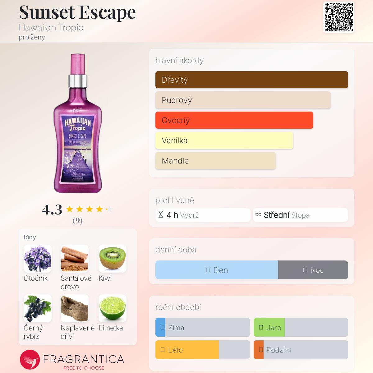 Sunset Escape podle Hawaiian Tropic je Aromatic Fruity vůně pro ženy. Sunset Escape byl/a uveden/a v roce 2017. Vrchní tóny jsou Kiwi, Černý rybíz a Limetka; střední tóny jsouOtočník a Jasmín ; základní tóny jsou Santalové dřevo, Naplavené dříví a Pižmo.
