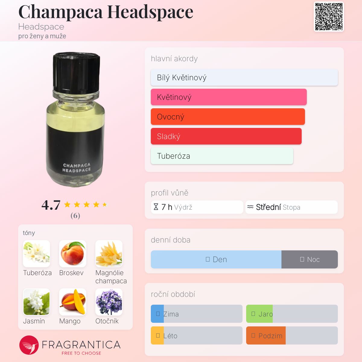Champaca Headspace podle Headspace je Floral Fruity vůně pro ženy a muže. Toto je nová vůně. Champaca Headspace byl/a uveden/a v roce 2025. "Nosem" za touto vůní je Julien Rasquinet. Vrchní tóny jsou Broskev, Mango a Růžový pepř; střední tóny jsouTuberóza, Magnólie champaca, Jasmín a Pelargónie ; základní tóny jsou Otočník, Pižmo a Cypřiš.