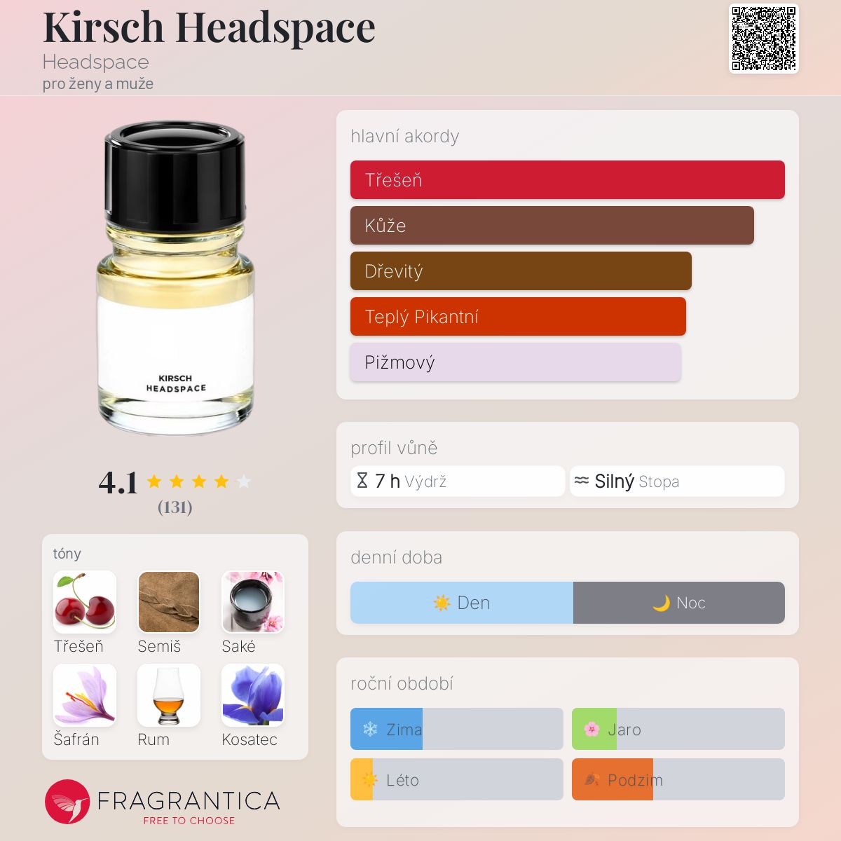 Ať je to tak, budu první, kdo zanechá komentář k této vůni. Objevila se mi na konci roku 2023 jako dárek. Při googlování jsem se o ní dozvěděla, že byla vytvořena v roce 2023 a přesně, jako neodborník, mohu říct, že její zvuk je neobvyklý a komplexní. Z deklarované třešně na vrcholu pyramidy slyším z nějakého důvodu malinu střídanou s třešňovým bonbónem, velmi nepostřehnutelný prášek, ale je tam, trochu kůže a na konci vůně kouře z ohně, velmi věrohodné. Vůně je hřejivá, sladká, ale s mírou, bohužel ne moc vytrvalá, 4-6 hodin zní a vůně kouře na oblečení až den. Líbí se mi a je velmi vhodná na teplou zimu.