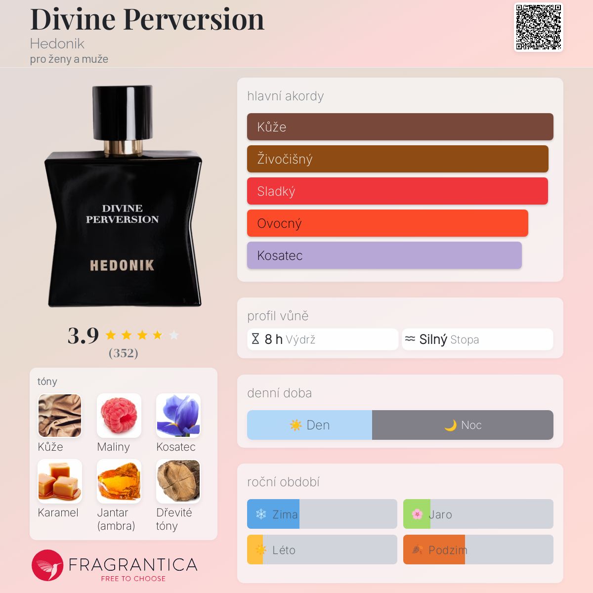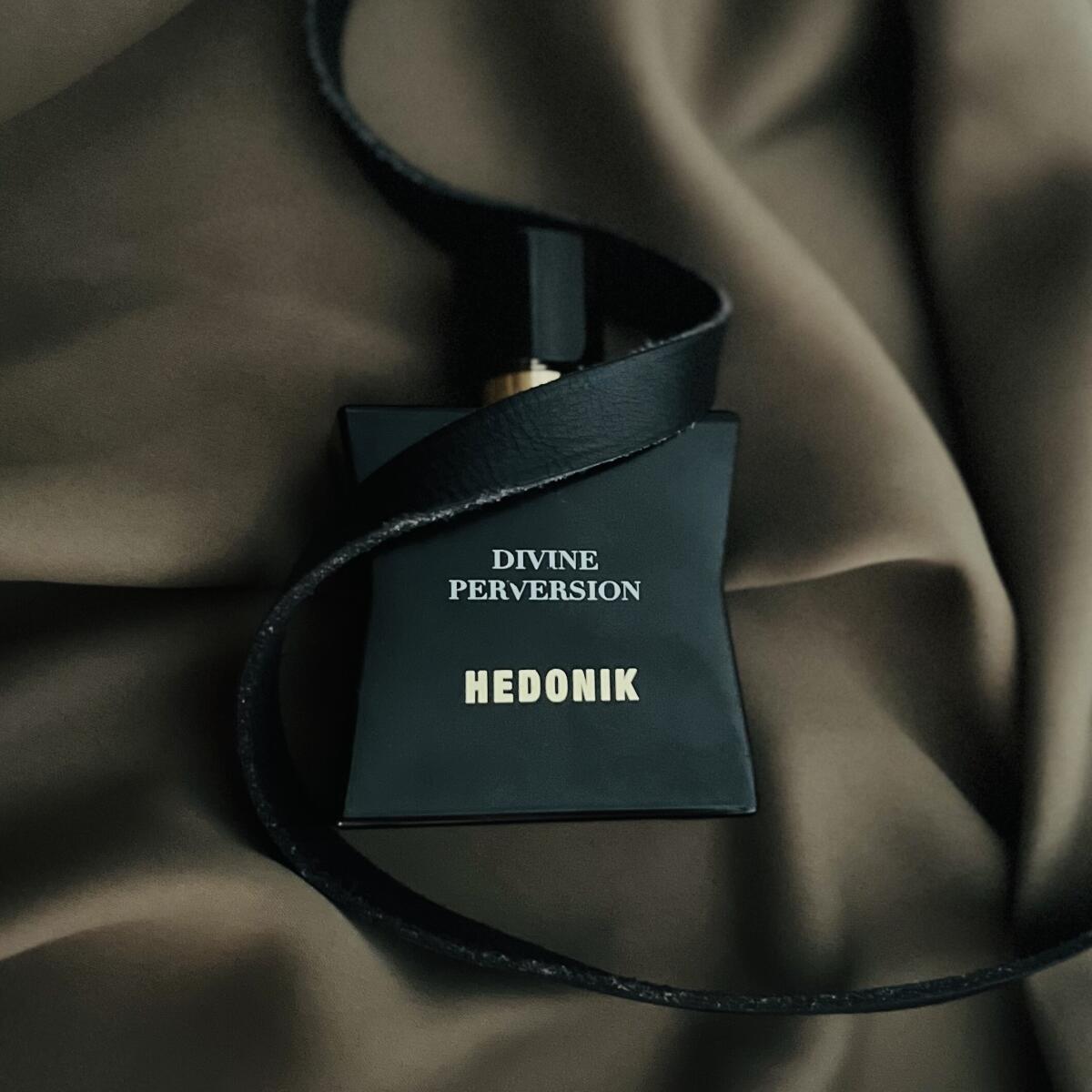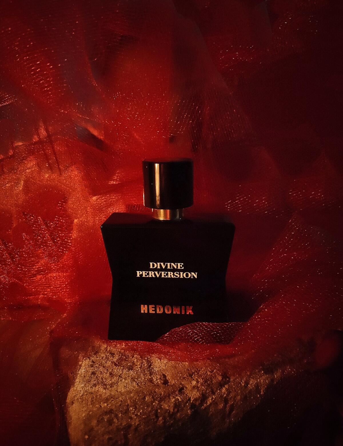 Divine Perversion podle Hedonik je Leather vůně pro ženy a muže. Divine Perversion byl/a uveden/a v roce 2021. "Nosem" za touto vůní je Francesca Bianchi. Vrchní tóny jsou Maliny a Růžový pepř; střední tóny jsouKosatec, Karamel a Růže ; základní tóny jsou Kůže, Jantar (ambra), Dřevité tóny a Zvířecí tóny.