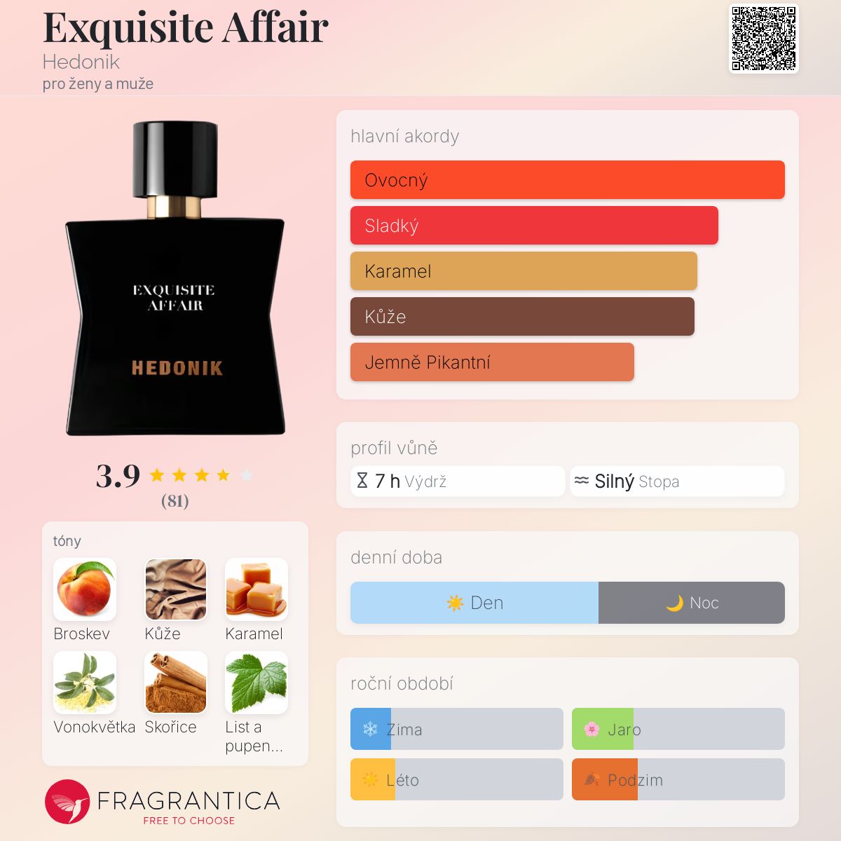 Exquisite Affair podle Hedonik je Leather vůně pro ženy a muže. Toto je nová vůně. Exquisite Affair byl/a uveden/a v roce 2024. "Nosem" za touto vůní je Francesca Bianchi. Vrchní tóny jsou Mandarinka, Růžový pepř a Bergamot; střední tóny jsouBroskev, Vonokvětka, Skořice a Černý rybíz ; základní tóny jsou Kůže, Karamel, Cukrová vata, Vanilka, Santalové dřevo a Pačuli.