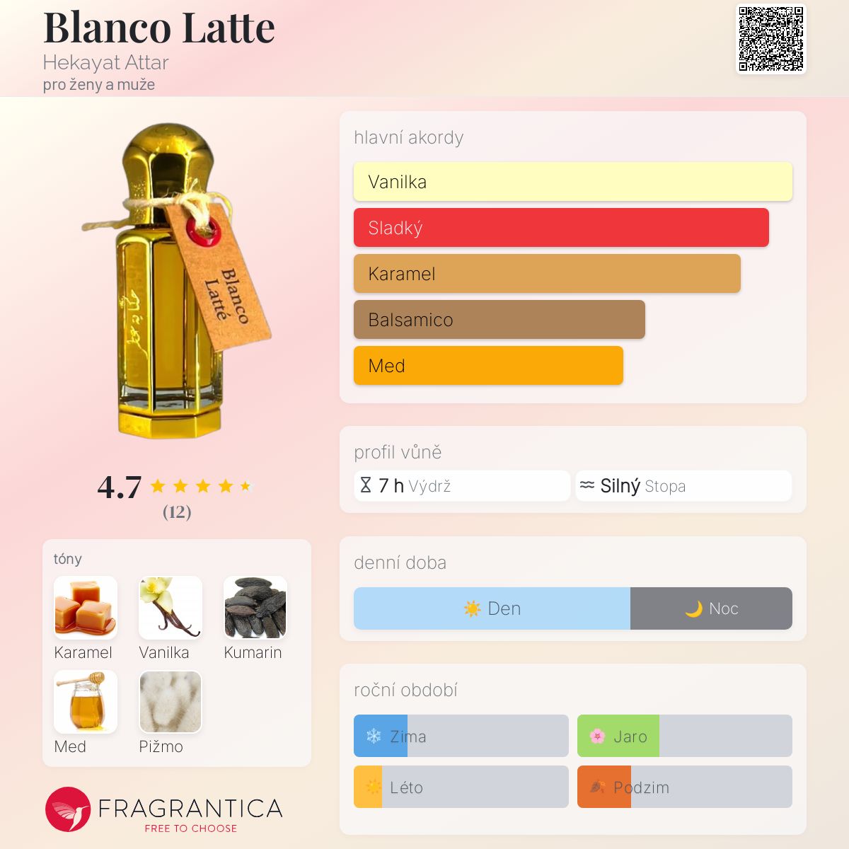 Blanco Latte podle Hekayat Attar je Orientální Vanilla vůně pro ženy a muže. Vrchní tón je Karamel ; střední tóny jsouKumarin a Med ; základní tóny jsou Vanilka a Bílé pižmo.