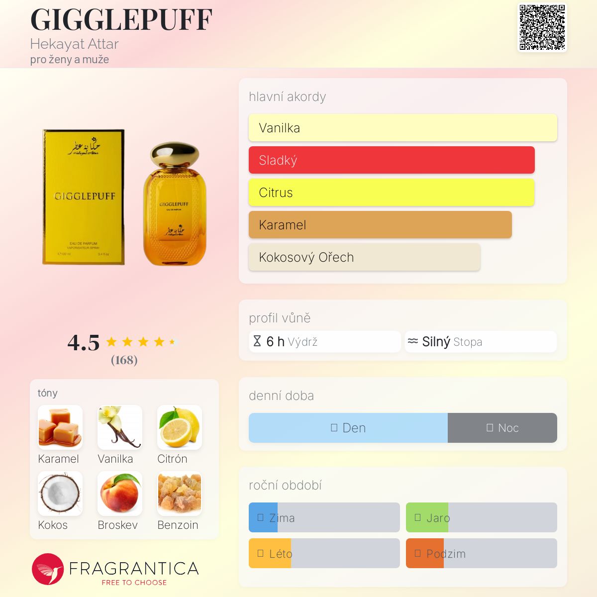 GIGGLEPUFF podle Hekayat Attar je Floral Fruity Gourmand vůně pro ženy a muže. Vrchní tóny jsou Italský citrón, Kokos a Grapefruit; střední tóny jsouBourbonská vanilka, Broskev, Gardénie a Jasmín ; základní tóny jsou Karamel, Vanilkový lusk, Benzoin a Pižmo.
