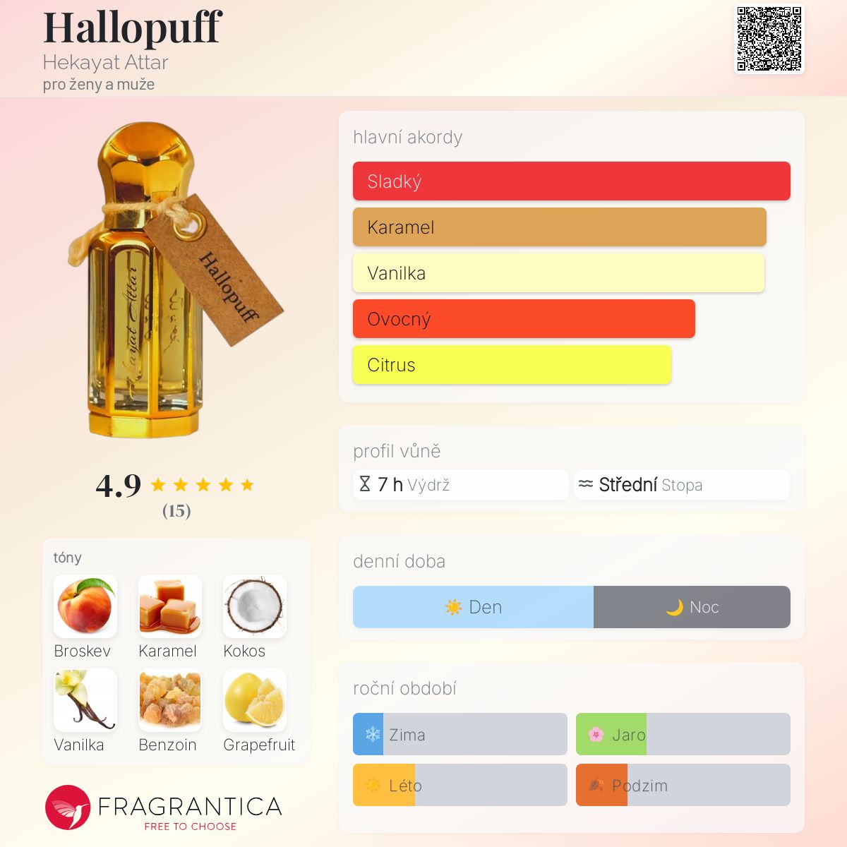 Hallopuff podle Hekayat Attar je Floral Fruity Gourmand vůně pro ženy a muže. Vrchní tóny jsou Kokos, Grapefruit a Italský citrón; střední tóny jsouBroskev, Bourbonská vanilka, Gardénie a Jasmín ; základní tóny jsou Karamel, Vanilka, Benzoin a Pižmo.