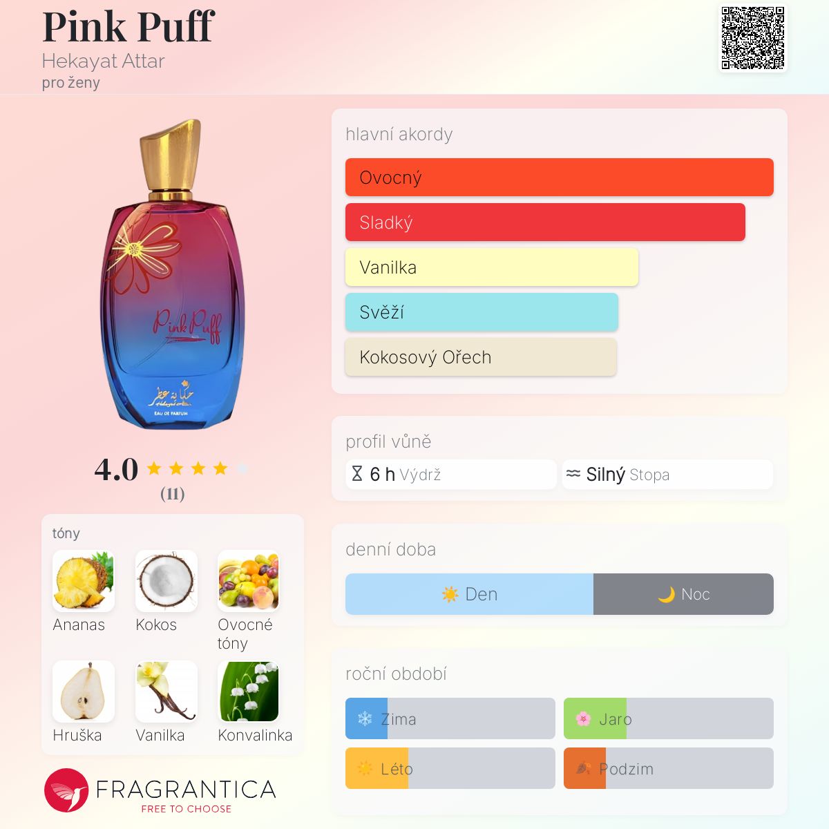 Pink Puff podle Hekayat Attar je Orientální Floral vůně pro ženy. Vrchní tóny jsou Ananas, Kokos, Exotické ovoce a Hruška; střední tóny jsouKonvalinka, Květ jabloně a Otočník ; základní tóny jsou Vanilka, Santalové dřevo, Jantar (ambra) a Pižmo.