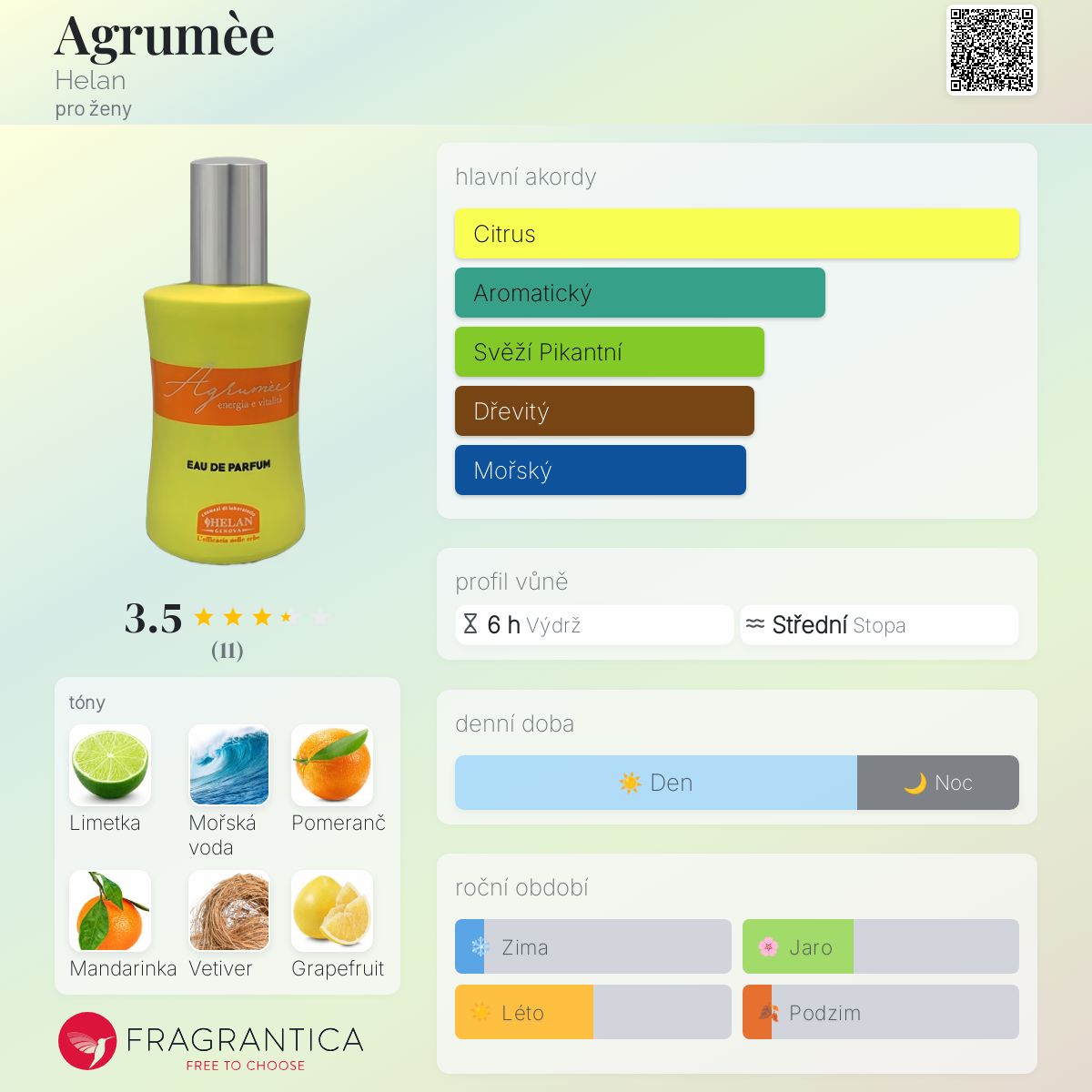 Agrumèe podle Helan je Citrus Aromatic vůně pro ženy. Vrchní tóny jsou Limetka, Zelený pomeranč, Italská mandarinka, Grapefruit, Citrón, Yuzu a Kumquat; střední tóny jsouMořské tóny, Pelargónie, Egyptský jasmín a Turecká růže ; základní tóny jsou Haitský vetiver, Texaský cedr, Bílé pižmo a Jantar (ambra).