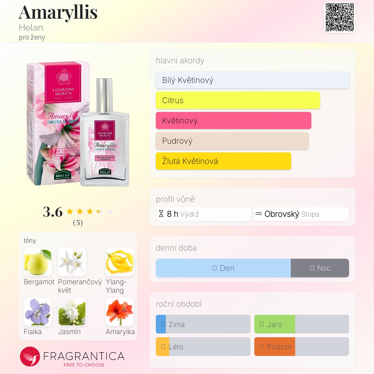 Amaryllis podle Helan je Floral vůně pro ženy. Vrchní tóny jsou Kalábrijský bergamot a Pomerančový květ; střední tóny jsouYlang-Ylang, Francouzská fialka, Egyptský jasmín a Amarylka ; základní tóny jsou Bílé pižmo a Siamský (thajský) benzoin.