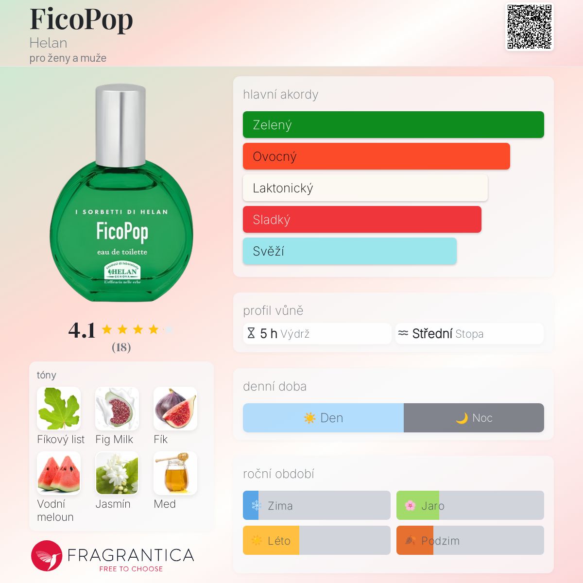 FicoPop podle Helan je Floral Fruity vůně pro ženy a muže. Toto je nová vůně. FicoPop byl/a uveden/a v roce 2025. Vrchní tóny jsou Fíkový list, Fíkové mléko a Vodní meloun; střední tóny jsouFík, Jasmín a Broskvový květ ; základní tóny jsou Med, Ovocné tóny, Jantar (ambra) a Pižmo.