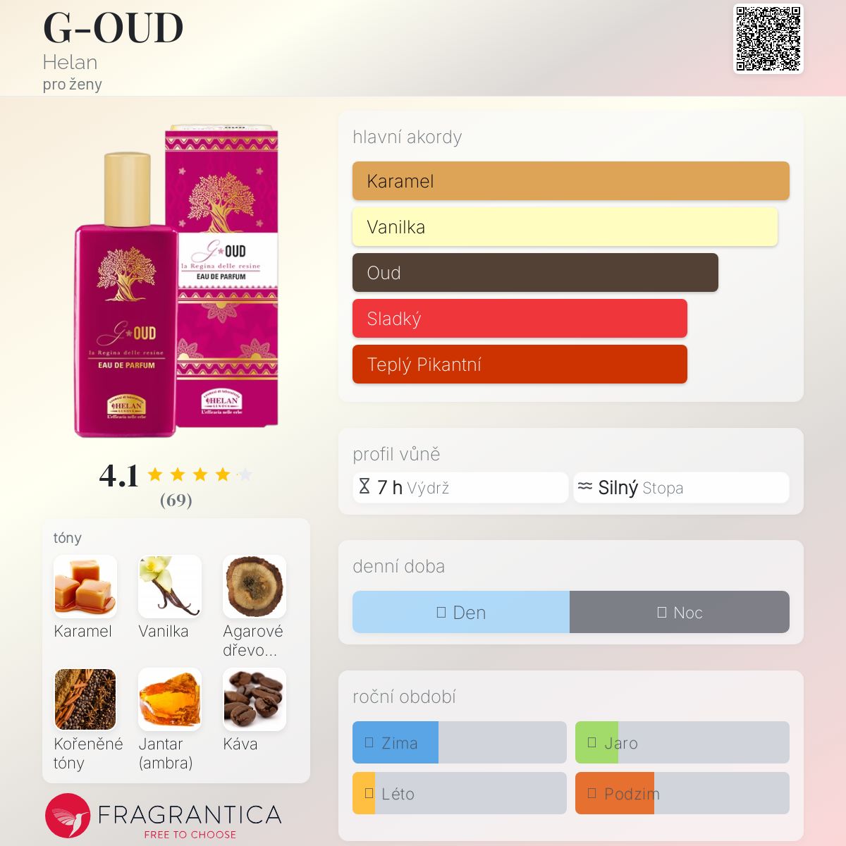 G-OUD podle Helan je vůně pro ženy. Vrchní tóny jsou Karamel, Kořeněné tóny, Káva a Karafiát; střední tóny jsouVanilka a Agarové dřevo (oud) ; základní tóny jsou Jantar (ambra) a Bílé pižmo.