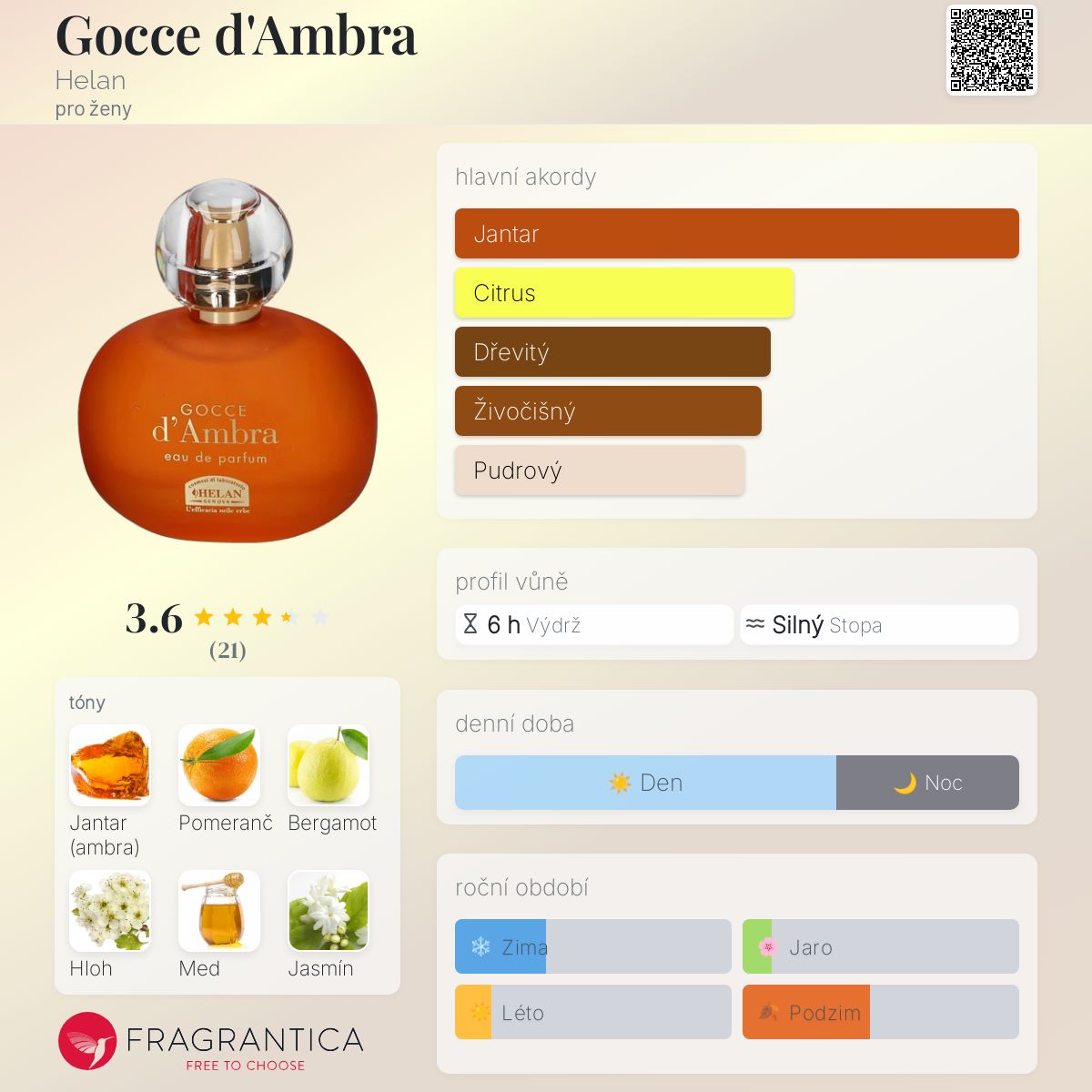 Gocce d'Ambra podle Helan je vůně pro ženy. Gocce d'Ambra byl/a uveden/a v roce 2018. Vrchní tóny jsou Sladký pomeranč, Kalábrijský bergamot, Hloh a Med; střední tóny jsouJantar (ambra) a Jasmín ; základní tóny jsou Jantar (ambra), Cedr, Pačuli a Vetiver.
