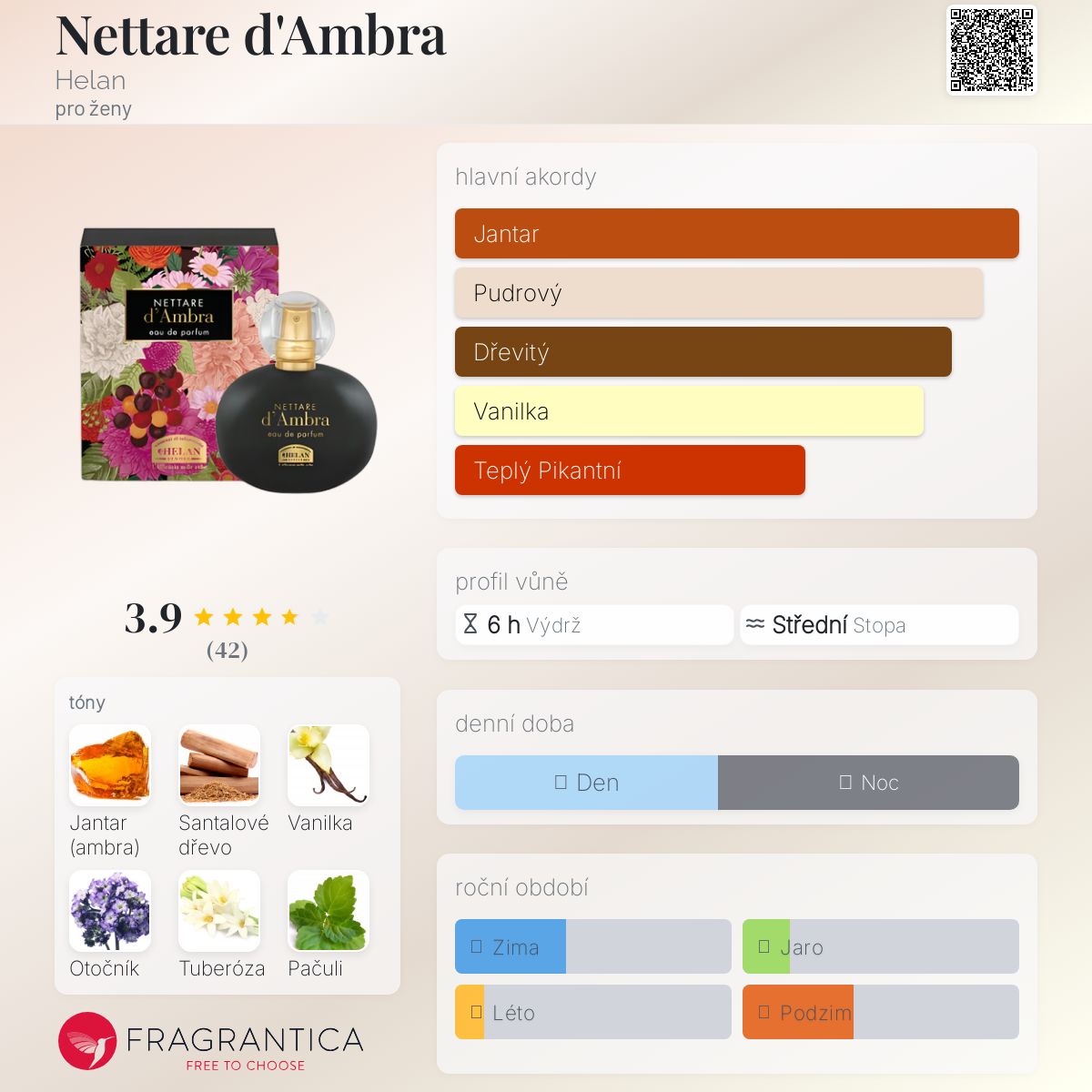 Nettare d'Ambra podle Helan je vůně pro ženy. Vrchní tóny jsou Jantar (ambra) a Bourbonská vanilka; střední tóny jsouOtočník a Tuberóza ; základní tóny jsou Jantar (ambra), Santalové dřevo a Pačuli.