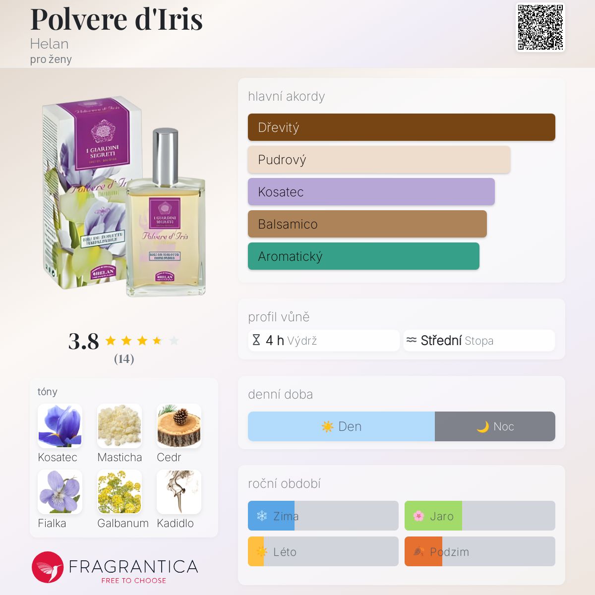 Polvere d'Iris podle Helan je Chypre Floral vůně pro ženy. Vrchní tóny jsou Toskánský kosatec, Masticha, Parmská fialka a Galbanum; střední tóny jsouTexaský cedr, Kadidlo, Haitský vetiver a Pomerančový květ ; základní tóny jsou Bílé pižmo a Madagaskarská vanilka.